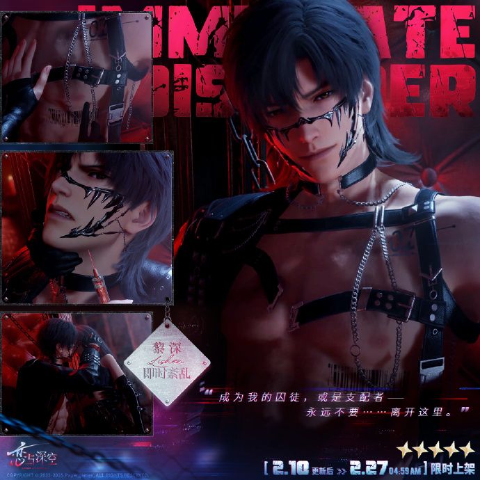 猎人可从限定五星思念「沈星回·虚构妄想」、「黎深·即时紊乱」、「祁煜·狂热剂量」、「秦彻·无罪樊笼」、「夏以昼·附骨之痕」中任选3张,所选思念许愿概率限时大幅提升,占五星获取几率