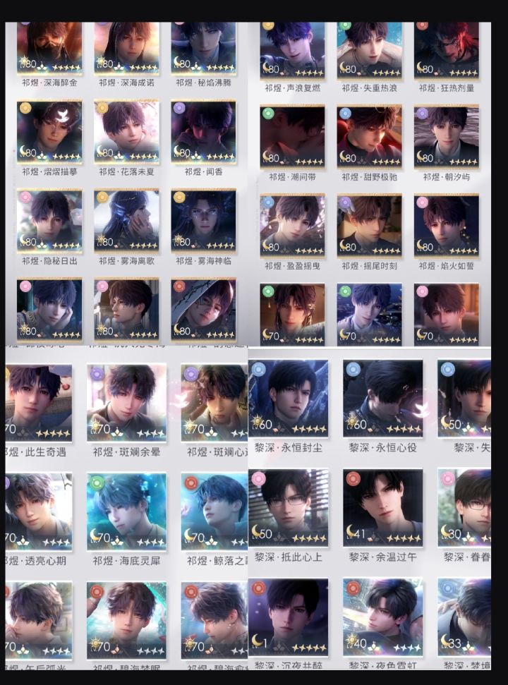 求各位夫人们帮忙估号自建号,应该是龙彻那会入坑的,鱼推,祁煜三套日卡都有,深海满花,限日一阶,小海神还有一个盒子没开,零阶深渊,零阶光猎,其他三个都只有常驻日卡。氪条两千多,三档年卡都买了,有红底照。#恋与深空