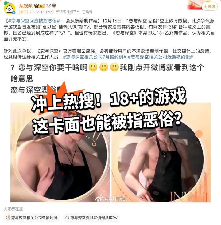 《恋与深空》于今天12月16日公开了角色夏以昼的限定五星思念卡“慵懒共谋”。该卡面以夏以昼为主控做早餐为主题,因画面中角色裸露上身并带有亲密痕迹,互动包含拥抱、喂食等亲密动作,被部分玩家形容为“恶俗”。面对争议,官方客服表示会将玩家反馈转达给制作组,而限时卡池将于12月18日开启,活动持续至27日,目前卡面内容是否会进行调整还不确定。卡面上夏以昼上身没赤裸,比夏日游泳卡穿的都多,而且这是18+