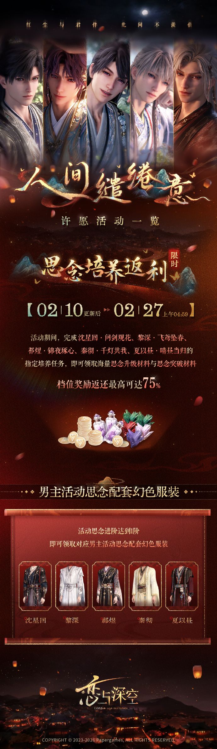 1.活动期间,猎人可从限定五星思念「沈星回·问剑观花」、「黎深·飞鸢坠春」、「祁煜·锦夜琢心」、「秦彻·千灯共我」、「夏以昼·晴昼当归」中任选3张,所选思念许愿概率限时大幅提升,占五星获取几率的75%。
