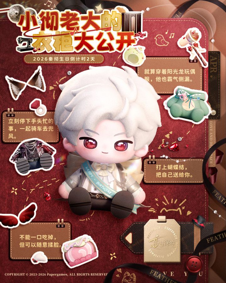 今日,《恋与深空》官方发布秦彻生日主题新动态,距离他的生日(4月18日)仅剩2天,为他精心准备的专属棉花娃娃已制作完成,可爱模样正式亮相。这款棉花娃娃完美还原了秦彻的标志性形象:标志性白发、赤红眼眸,搭配标志性红黑穿搭,每一针一线都尽显用心。软萌的造型与他冷峻强大的人设形成反差,让玩家直呼“可爱到犯规”。作为生日活动的重要环节,玩家将在生日当天,把亲手制作的棉花娃娃与生日蛋糕一同送给秦彻,触发