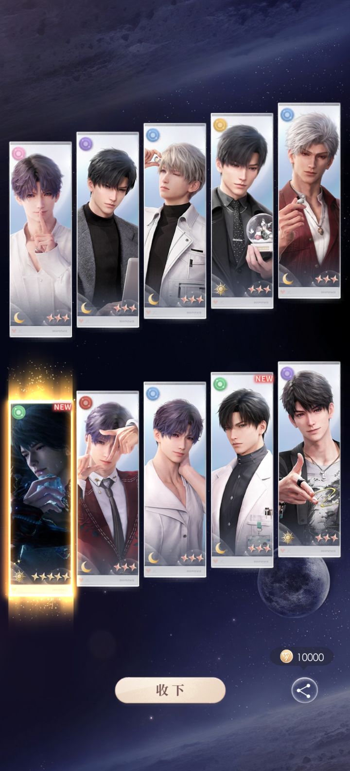 开局10抽保底开始抽的,没歪哈哈哈哈出了一张哥的新日卡,然后继续抽已经做好好保底出的心理准备了,结果一个10出下去出了另一张哈哈哈哈哈哈哈哈噢耶20抽拿下可以继续攒钻石了