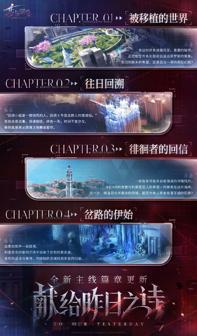 更多异象在临空市出现,暗中推波助澜的人并不陌生。遵从你的决心,去行动、去见证—— 💫「献给昨日之诗」主线剧情更新2026年1月2日上午5:00起,全新主线篇章「献给昨日之诗」开启。「被移植的世界」「往日回溯」「徘徊者的回信」「岔路的伊始」四章全新剧情等你体验。*通关「于深空之下」主线2-15即可进入主线新篇章,无需全通前置关卡。——— 跨越光年,与你并肩。《恋与深空》5.0版本