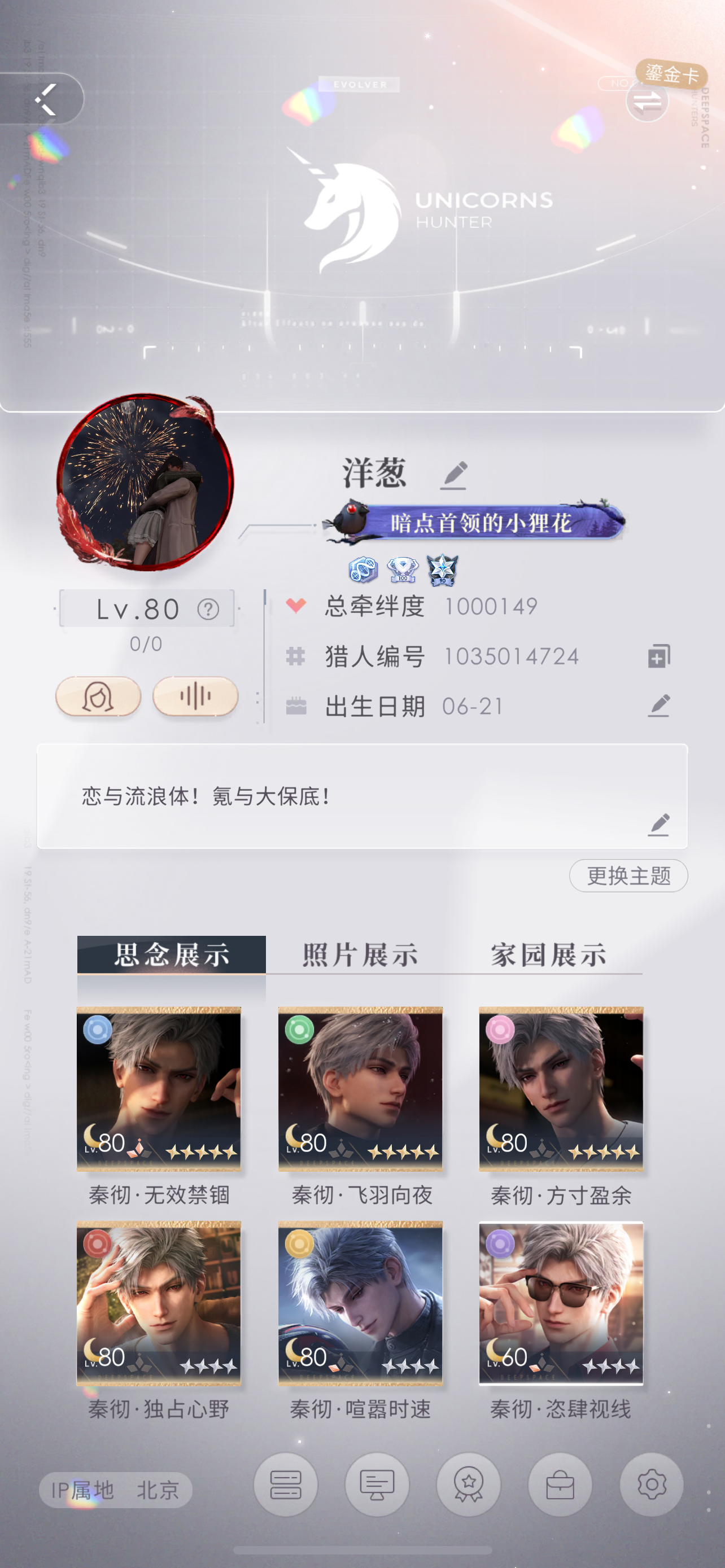 这四位男士的最后四个成就也拿完了,不得不说这个成就真的很折磨人,以后没有理由打开你们四位的主页啦,祝生活顺利天天开心。顺带一提哥的是12.月就拿到的,那段时间忙没办法天天做这个任务,今天也是终于拿到啦,有钻,敲开心~#夏以昼 #恋与深空 #游戏日常 #恋与深空手账