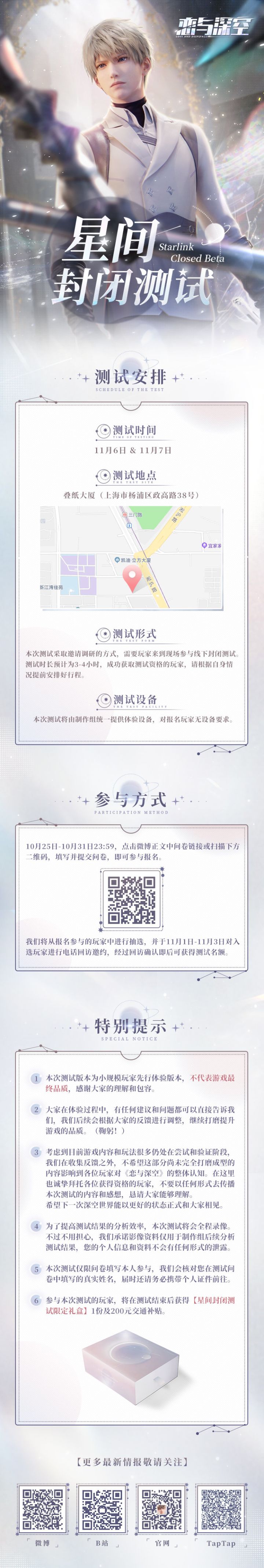 深空中藏着所有的秘密,和最深处的你。 招募开启!招募时间:即日起至2021年10月31日23:59报名方式:测试时间:11月6日 & 11月7日测试地点:叠纸大厦(上海市杨浦区政高路38号)>>特别说明:1. 本次测试为极小规模的封闭测试,制作组将从所有报名的玩家中进行挑选并定向邀请;2. 出于疫情防护考虑,请大家根据自身情况酌情报名,现场防疫措施会根据上海疫情防控的最新要求执行。