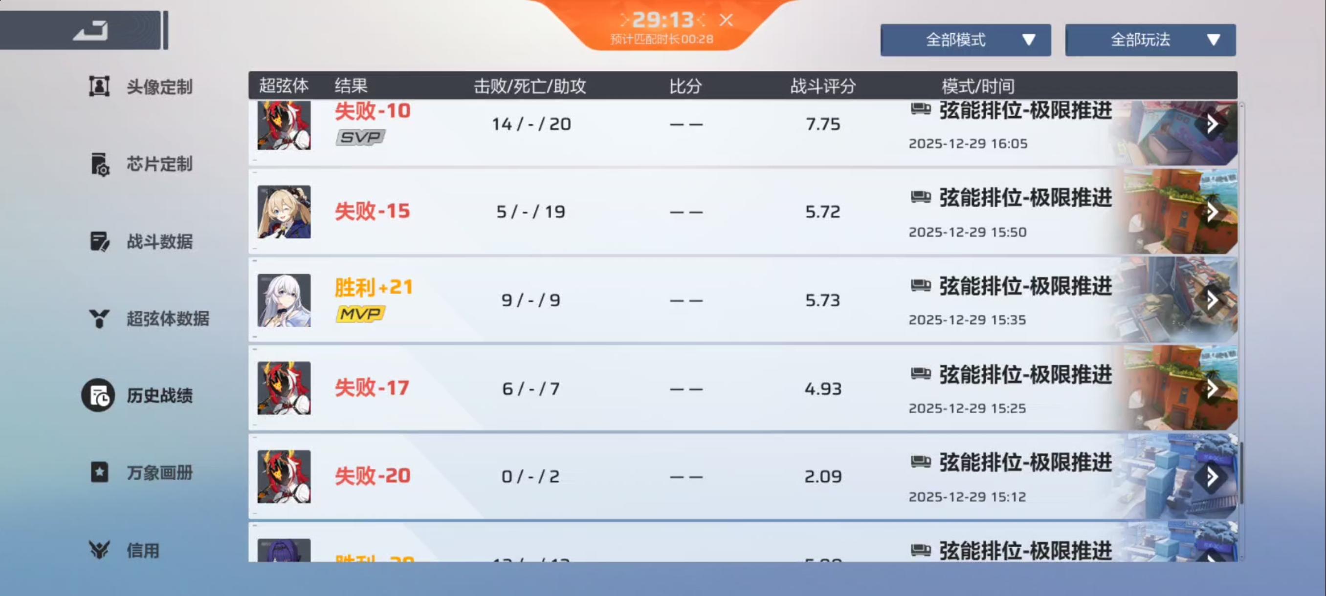 从超弦开始极限推进就很难匹配到人了,打超限推进又太看脸了,而且不知道是刷卡机制有鬼还是我脸太黑,经常打一半对面刷个炎帝或者剑圣,直接顺风变逆风最逆天的一次对面3个剑圣一个炎帝(看图2)爆破的话我又不玩,5v5团竞也是匹配不到人,看似4个模式实则2个