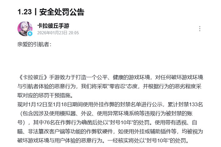 《卡拉彼丘》手游严打违规行为,百人被封,76人被封号十年 家人们们注意了嘻嘻!由Day1工作室开发、以二次元纸片人作为游戏特色的第三人称射击游戏《卡拉彼丘》,官方在1月份发布了安全处罚公告,向游戏里那些破坏公平的行为重拳出击目前具体的违规账号名单已经部分公开,官方进行公示的封禁名单中,包括在1月12日至1月18日期间使用外挂作弊的玩家,这些作弊用户被处以“封号10年”的处罚。对于玩家们来说,