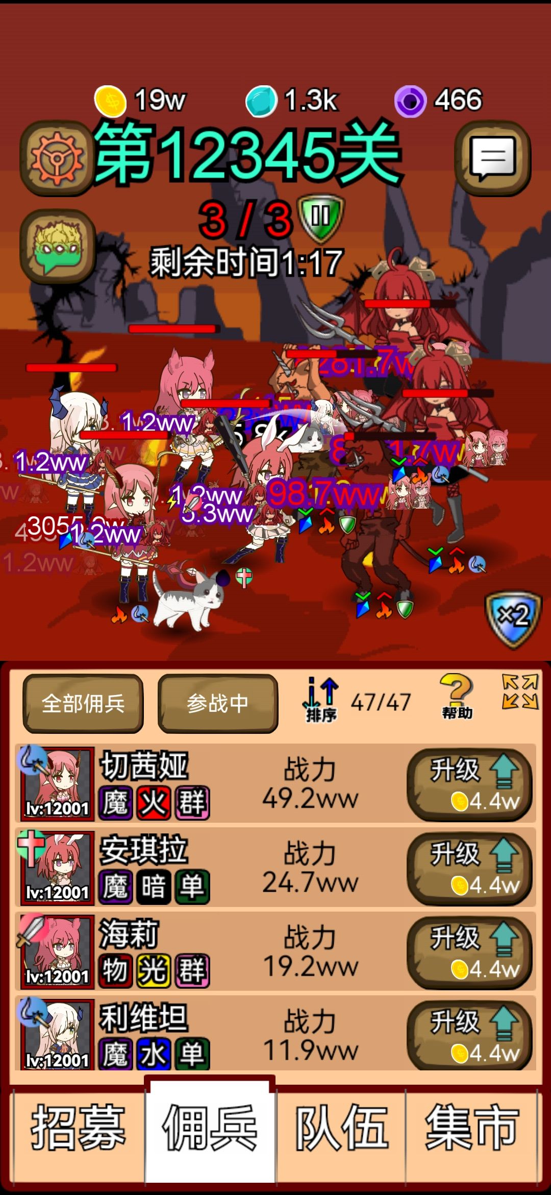 1.阵容选择 初始阵容最好能刷到火魔群切西娅,水魔单利维坦,物暗单艾琳,随便来两个奶,一个群奶一个单奶。根据敌方阵容抗性去更换出阵佣兵。 系统关卡送的物光群海莉和奶安琪拉之后,换上终极阵容 切西娅 利维坦 海莉 安琪拉,不需要换阵容,一路横推都不会卡关。 2.宠物选择 重生500次有个成就,有成就控的可以考虑早期攒足够宠物,最好能有个全加生命的宠物宝宝,对推图作用不小,配合安琪拉的加血效果杠杠的。