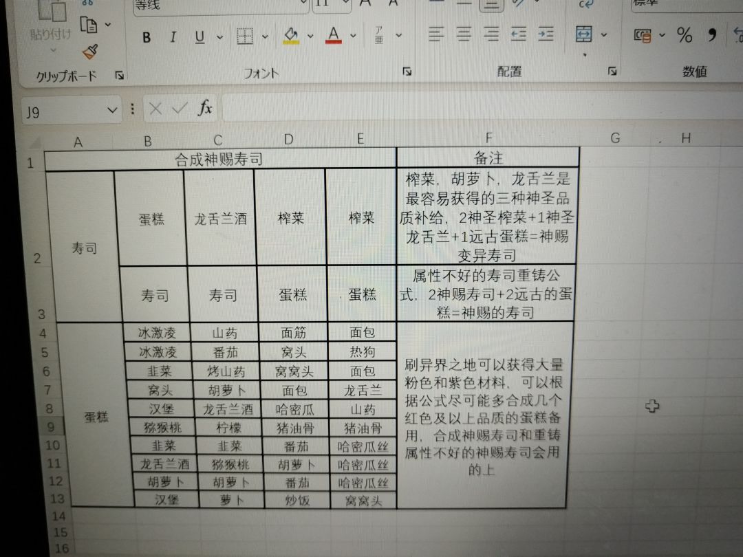在合成补给品时,我们最经常会遇到的问题是:通过炼金合成的补给品大多数是榨菜和胡萝卜,导致我们很难凑齐合成神赐变异补给品需要的原材料,严重影响到我们合成神赐变异补给品的效率。 但是在整理炼金公式时,我发现了一个很有用的公式:2榨菜+1龙舌兰+1蛋糕=寿司 榨菜,胡萝卜,龙舌兰是最容易通过炼金获得的补给品,玩了十几个小时的刷子们手中很容易积攒大量的神圣甚至神赐品质榨菜和龙舌兰,也就是说,我们只需要额外