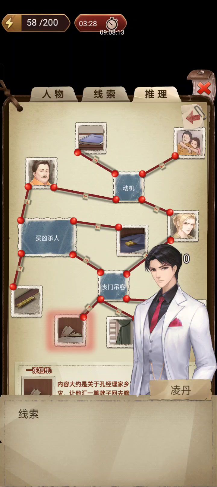 第二章程梦蝶房间(301)线索线索位置(线索分析5体力):1.地毯:【染血的手绢】、【死者的身体】(询问5体力)、【致命伤痕】2.地板:【地上的灰尘】3.桌子:【留声机】(询问5体力)4.柜子:【小皮箱】(带锁,密码:0821,是请柬上的日期)→【一箱金条】→图谋不轨5.书柜:【奖杯】→疑似凶手的线索、【一张白纸】(询问5体力)6.梳妆台:【台灯】、【剧本手稿】、【香烟与火柴】(询