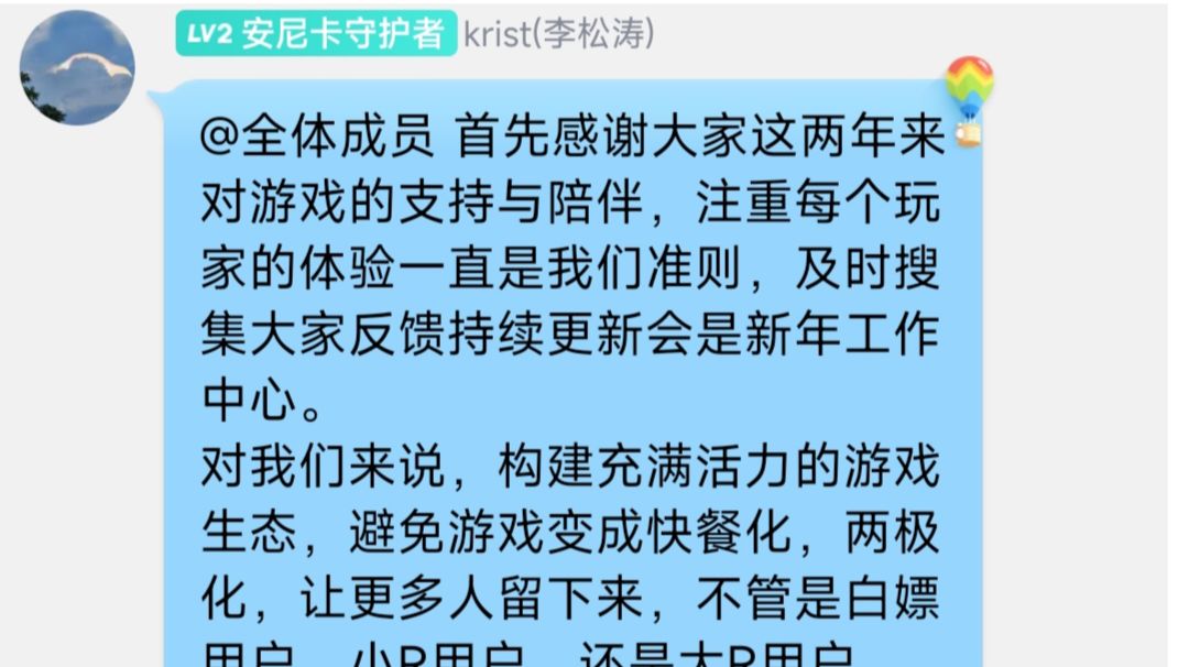 首先感谢大家这两年来对游戏的支持与陪伴,注重每个玩家的体验一直是我们准则,及时搜集大家反馈持续更新会是新年工作中心。 对我们来说,构建充满活力的游戏生态,避免游戏变成快餐化,两极化,让更多人留下来,不管是白嫖用户,小R用户,还是大R用户,都能找到自己的定位和乐趣十分关键,所以未来的更新也会在这个基准线之内,我始终认为,团队之间的互动、配合、兄弟感情比一个人靠纯氪金而天下无敌更有乐趣,这也是我们跟一