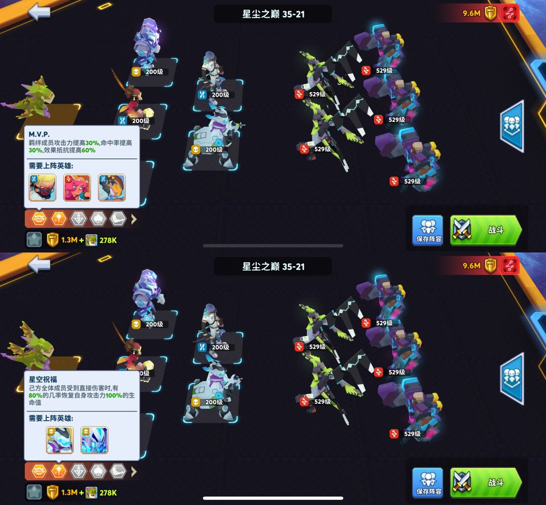 【攻略】发现宝藏新阵容!星空运动流(附个人经验) 服务区:665 角色名:京崽子 ID:1896446018203 工会:复仇者 本文内容共4章,一二章为个人经验,第三章为新发现的宝藏阵容,第4章总结。由于字数限制,一二章附于楼下。 3.发现新阵容 3.1 契机 -最近凑到了队长和英尼格玛的羁绊”星空祝福“(受到伤害有80%几率回复攻击力100%的生命值),加上队长的被动”和平主义“(开局降低双方66%攻击力和66%暴击伤害,第30秒回复我方全体55%生命上限),保命能力很强,所以开始思考三个输出位置。 -试过三姐妹(斗天使菲尼维多),但太脆+输出不够,太看脸;王牌(魔球雪人维多,60%减伤),够肉但输出不够;金虎茉,输出够,但推图32-10时,对面有双子和古老者,要么被混乱要么被秒,小茉被动都放不出来;甚至安息两个10星一个9星也还是打不过。 -后来突然看到麒麟的技能(高闪避、高后排单体伤害、高能量回复、高昏迷率5秒)以及他和金允美、魔球的羁绊(提高30%攻击力30%命中率60%抵抗效果),有麒麟闪避吃伤害+打后排、金允美打前排、魔球的续航以及不俗伤害,然后试了一下,直接从32-10一直推到现在的35-21(而且是基本满状态,还能继续推)。见图1、图2。 我在通关排名看了一下,关卡进度35-21,排名第32;第50名进度为33-16。 前10名阵容基本以金虎茉、传奇、神秘外星为主,达到了38-56至40-12;11-20名较为典型的有基因火舞四保一、生化国家队、魔球天使双核、金虎茉汤姆黑空为典型,达到了36-1至38-44;21-31名多为神秘外星、金虎茉吸血鬼古老、金虎茉队长英格为典型。 在前50名中,只有我用了“MVP”羁绊和“星空祝福”羁绊阵容,感觉自己发现了一个新的宝藏阵容,因此前来分享。我称之为“星空运动流”,取自于“星空祝福”羁绊和三位输出都是运动健将(棒球足球跆拳道),见图3。 3.2阵容特点 3.2.1. 不会猝死——减攻击+高闪避 后期敌人都是皮糙肉厚+伤害惊人的,以35-21的敌人为例,见图4对比。 敌我生命值和攻击力差别很大,需要我们扛到魔球的回血被动出来十分困难,不能开局猝死。我们这里说的“不会猝死”不是指“血厚”或者“防御力高”,而是利用“星空祝福”的回血+麒麟的高闪避率去吃伤害,抵御过第一轮攻击,再在第30秒享受队长的被动回55%的血量。 3.2.2 伤害爆表——同时打击敌方前后排 -后排:利用麒麟的“闪避加能量”被动和英格加40点能量被动,前20秒内就麒麟可以发动5次大招,伤害非常可观,暴击的话一下死一个后排;就算没暴击,大招也会昏迷后排5秒,5秒内麒麟可以再次开大,基本上后排控到死。 -前排:金妹打前排非常痛,大招打一个人1500%,连击点数一般能到5,再对前排打1170%的伤害,再加上魔球大招打三个人1000%左右的伤害,可以说是伤害爆表。 -此外,英格除了能回复能量,还有超强的大招——复制一个敌方攻击力最高的英雄的幻象。 3.2.3 麒麟的“不要钱”大招——获得能量极快 -麒麟两个被动都有利于获得能量,第三个被动本身就提高66%的闪避率,且一次闪避成功加8点能量;第四个被动是一个爆裂印记加33%闪避率和33%能量获取速度,就算有debuff也至少可以发动4次。 -此外还要归功于英格的被动,普攻40%的几率给英雄获得40点能量,所以麒麟可以4秒一个大,跟不要钱似的。 3.2.4 ”无限“麻痹和眩晕——金妹和英格兰控制联动 -除了麒麟的大招可以昏迷地方后排5秒,英格在受到攻击时也有40%几率麻痹对方,金妹的大招以及有5个连击点数后也可以麻痹前排;此外,金妹的普攻有40%的几率让处于麻痹状态的敌人昏迷5秒。 3.2.5 “无限”续航 细数一下这个阵容里回血的技能。 1.队长的被动——第30秒恢复55%血量; 2.队长大招后——开普勒的每次普攻恢复3个英雄100%防御力的血量(69.5K),注意是每次普攻(刚才去看了一下开普勒的名字,不小心又过了两关hhh); 3.“星空祝福”羁绊——受到攻击有80%几率回复攻击力100%的血量; 4.魔球被动“帽子戏法”——得分印记达到3个后,每秒回复生命上限5.5%的生命值,并且提高我方55%攻击力和88%命中率,十分霸道。 3.2.6 总结 -高闪避、高伤害、能量获得快、控制多、续航强。 -非要说缺点的话,我用这个阵容卡在摩天楼545层,前排两个8.3M的紫霸王还能复活,最后时间不够了,打不死复活的紫霸王,所以还需要在伤害、生命值和续航方面(魔球一下被后排皇后射死)再做提升。 4.总结 作为一个入坑一个多月、小氪几百、运气还算好、滚过好几个服的入门玩家,希望这篇啰里八嗦的攻略能够给各位一点点收获。各位有问题也欢迎回复哦~