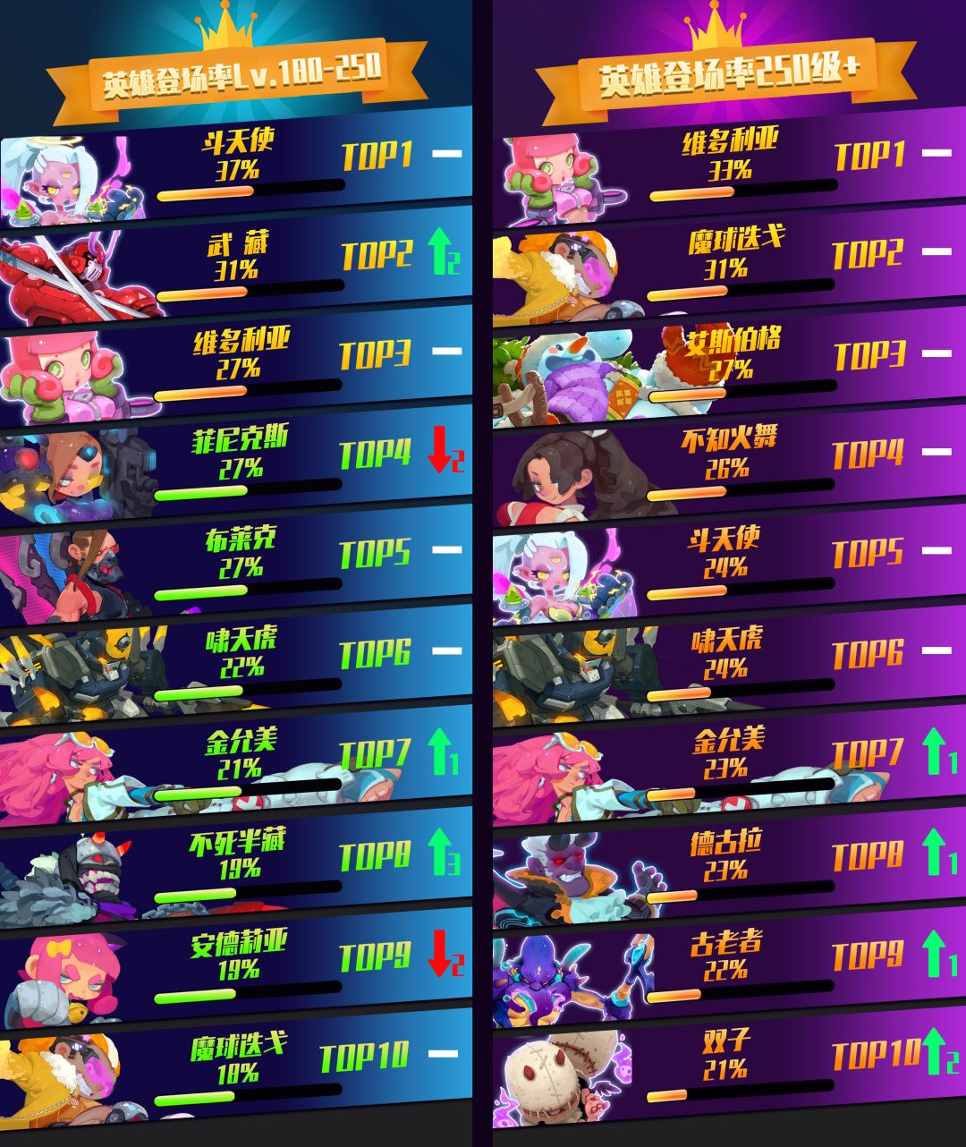 英雄登场率 英雄登场率180 -250 斗天使前期作为坦核排在第一名当之无愧!紧随排在二三四五名的是霹雳娇娃羁绊成员和一刀入魂羁绊成员,这两个羁绊可称之为前期“超级羁绊”,,试过的大大都知道PVP和PVE都很强势 英雄登场率250+ 前三名是分别是维多利亚,魔球迭戈,艾斯伯格。这三个英雄相信大家再熟悉不过了,羁绊王牌登场为队伍提高坦度,且这三个英雄本身就带续航,想要一口气按死,可没那么容易。 英雄