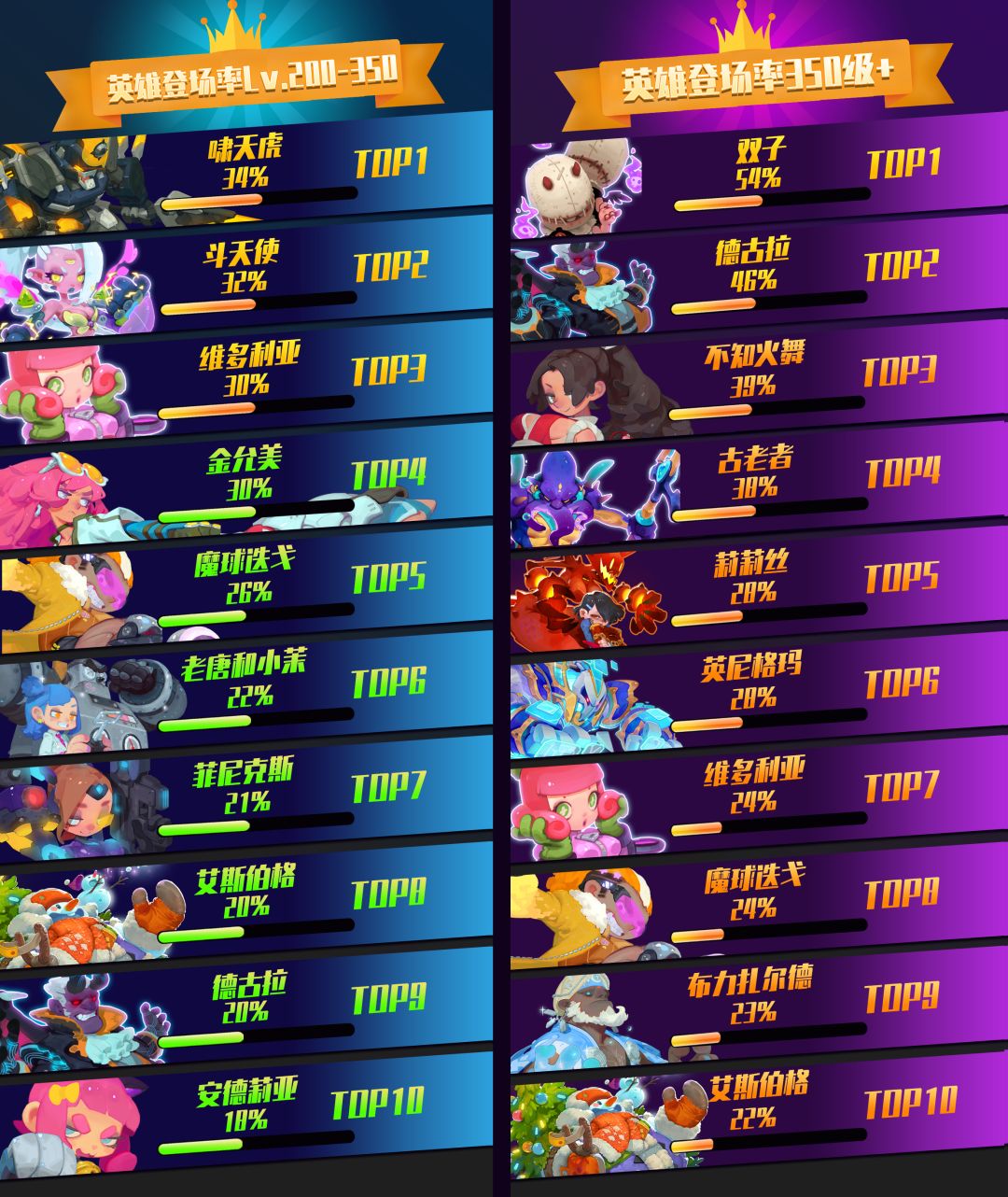 英雄登场率 英雄登场率200-350级 啸天虎,斗天使,维多利亚,金允美都是登场率在30%以上的英雄,依次排在前四名。本期英雄登场率200-350级阶段中并没有看到生化英雄的登榜,看来在这个等级阶段的大大们还是偏喜欢带有回复能力和爆发的英雄。 英雄登场率350级+ 双子作为“混乱之王”以54%的登场率稳居排行榜第一。混乱这个效果不仅能让中混乱的英雄有几率攻击队友,还会让其释放不出大招,的确是个让人