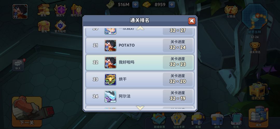 首先看图,99级通关排名22,微氪金,上下都比我高级,战力比我高不少,我的阵容是德古拉,莉莉丝,阿尔法队长,古老者,英尼格玛。这个阵容好处是前期不会死,中期爆发高,我觉得比官方推荐的还好用