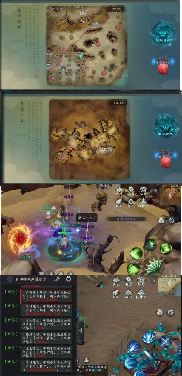其实不周山石的攻略很早山海无量心就出过了,我也是跟着他的攻略找齐的,链接如下。 人家写得很齐全了,不过前几天有个“十年老粉”友友说想我弄一个图文的,emmmm……鉴于不知哪来的“十年”,就弄一个吧 1、黄沙--司秋谷: 黄沙之城——荒凉山谷——打完BOSS,出现传送门——司秋谷首杀,不周山石。 2、黄沙老祖幻境 黄沙之城——(图1红圈)沙漠洞穴——(打完BOSS出现传送门)黄沙老祖幻境——开宝箱,