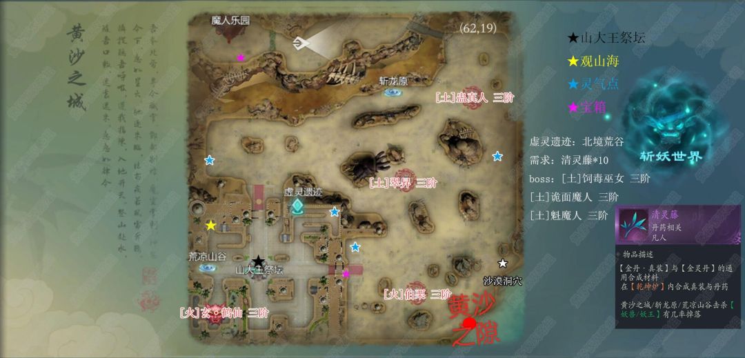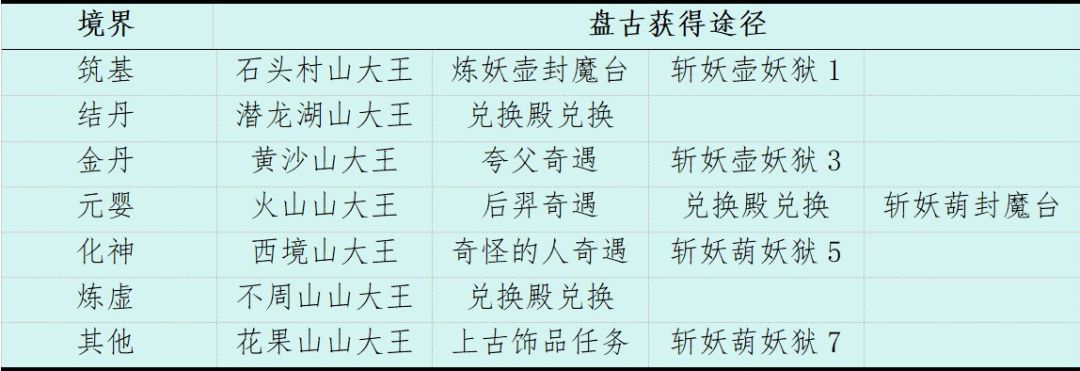 注意点: 1.封魔台在筑基和元婴地图开放时,只需开问山海解锁迷雾就会得到玄黄气,一共两个,相当于1*盘古石=1*玄黄气。 2.夸父奇遇需要结丹地图葬剑谷剑魔爆的凝光神水*1,刷进阶材料时候要多刷一个。 3.奇怪的人需要在迷津渡最上方购买奇怪的人售卖的卷轴才能开启奇遇,黄沙图问山海上方也要对话一次然后才能在西境雪原地图boss雪猿诅咒上方树后面对话领取盘古石*1。 4.斩妖葫妖狱需要打花果山云谷的二