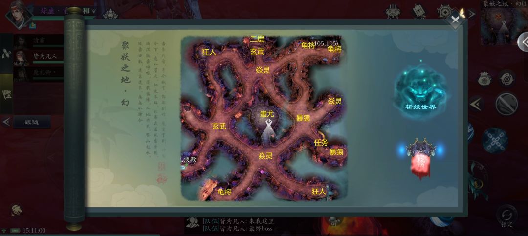 按照一二三的顺序,蚩尤、太白、大鹏鸟是各层的最终boss,打死后掉落聚妖令,同时会出现一个传送阵,进去后和地图中间的萧居居对话,奖励5万灵石,总共就是15万灵石。第一二层因为有几个任务我已经提交了,后面自己没找到位置,所以就没有标全。都很简单。 幻聚妖之地都是六阶怪,正常炼虚,没有神装和伏羲神农一样可以单人打过,难度小。 集其三个聚妖令后,去真聚妖之地三层,打死中间的大鹏鸟开启传送阵,可以拿到最终
