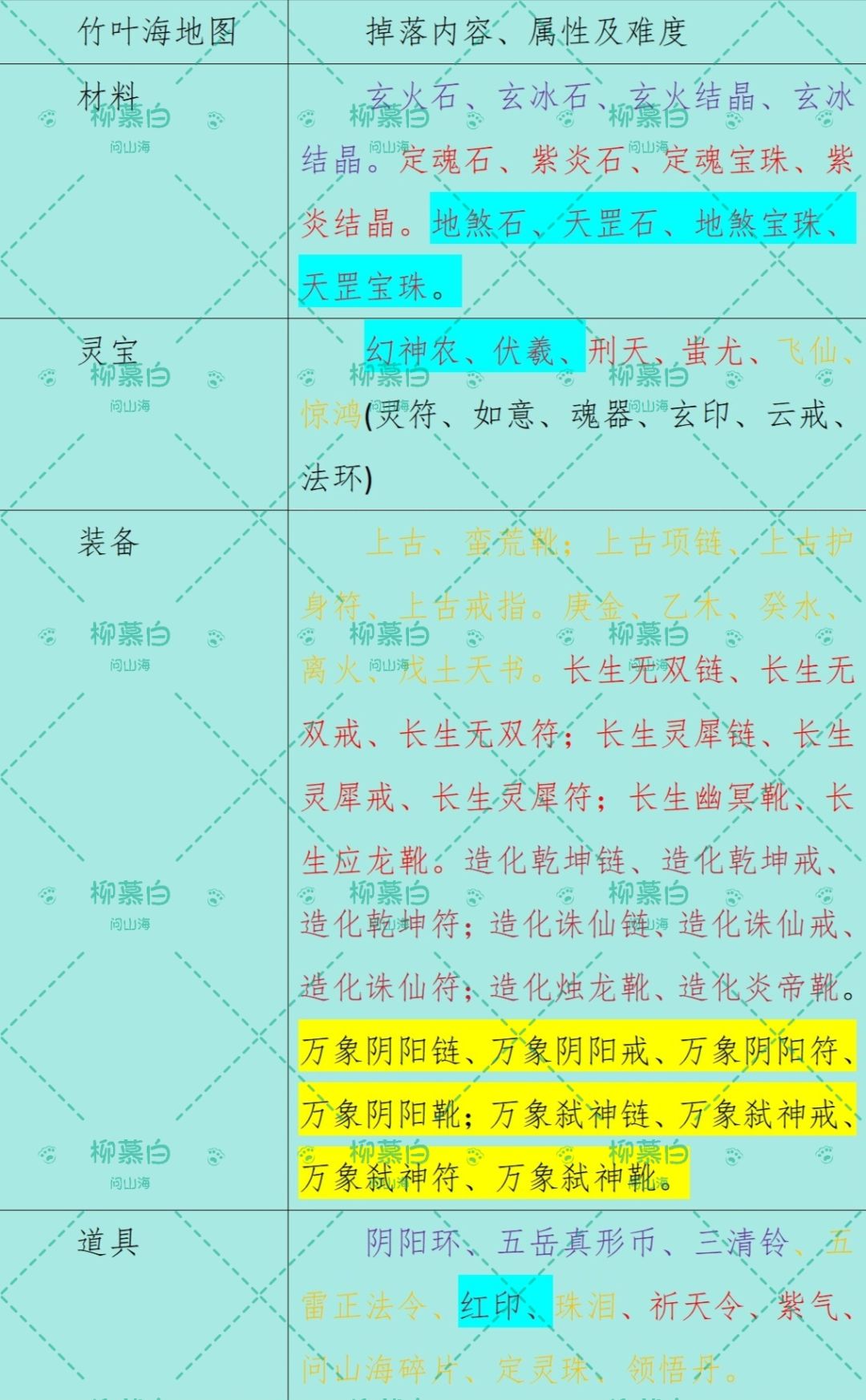 天涯海角作为问山海“第一大牢”自然是有必要讲一下的,老白我玩问山海那么多测,至少80%的时间搭进去刷这个了,确实爆稀有的装备也是游戏最大的爽点之一了。 本次攻略主要是针对三个秘境掉落进行分类统计,其中按颜色排比掉落难度从低到高依次是:紫、金、红、深红/蓝色填充、金色填充(比如神农伏羲、天罡石属于蓝色填充,只有万象为金色填充)。 浅浅说明一下,竹叶海只有五阶狮子狗可以掉落万象(现版本毕业饰品及鞋