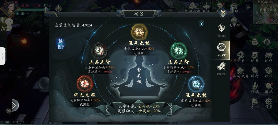 1(灵根):经常在群里遇到有道友问灵根的问题,其实很简单,灵根只影响对应槽位镶嵌功法的加成问题。以及天书的伤害.跟你的神兵灵饰无关,可以随意选择你的神兵或者灵饰。单灵根后期点满130,其余的为50%。 2(功法):本游戏中一共有五套功法,可以通过对话,地图中的商店,祁天兑换商店,师门好感度回礼,以及珍宝阁以及藏书阁购买等方发法获的。优先把属性加成高的功法放到你的对应属性灵根里。藏书阁每天能刷新五次