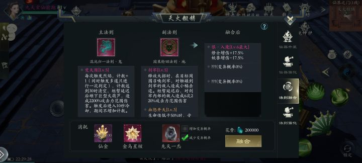 一直想着啥时候能合个双粉词条的粉法则出来,前面经历了几波单lv6粉法则赌博失败(两个单lv6粉法则,一个相同词条都没有相融合),今天它终于来了,本来想着词条等级最差是643 有个643 653都满足,没想到随机到655,这融合法则总算是欧了一把