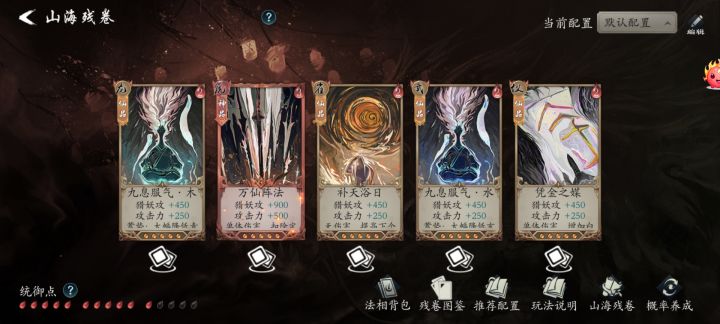 残卷很重要,所以单开一章。打架红色残卷,目的是堆基础攻击力,不过多说了。刷图:1.主流就是万仙阵法,五色神光青,五色神光黄。因为这三个伤害最高。目前版本,因为法则加持,建议无脑选万仙。至于青,黄,很费精力,还需要学会如何去看残卷怎么出。出现概率是这样的,青>红>黄>白 四色各有一个珠子出两仪,这里值得注意的是:黄和红原本的位置是相反的。2.搭配:建议九息服气木,万仙阵法,九息服气火,九