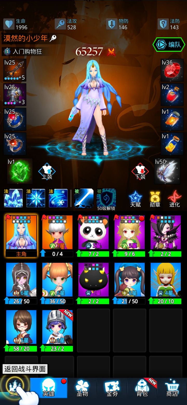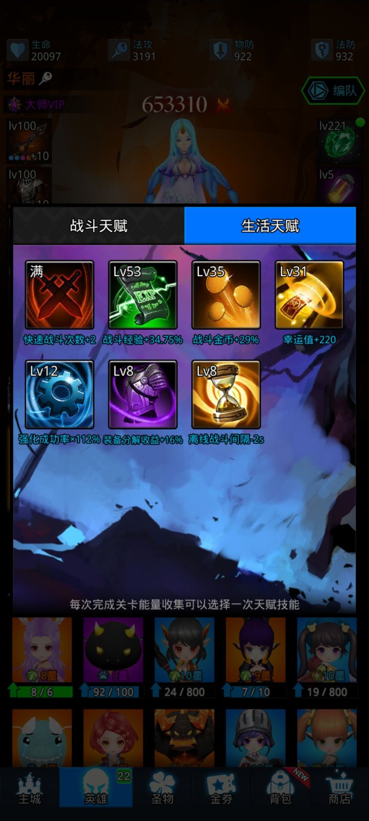 萌新刚刚玩需要了解的首先天赋选择,优先生活天赋,经验>>离线间隔>金币>幸运(快速次数第一)如下图从以上可以知道这游戏经验是最重要的,所以有点钱尽量氪第一个经验唯一,然后战斗掉落选经验瓶,魔瓶七级以后换其他