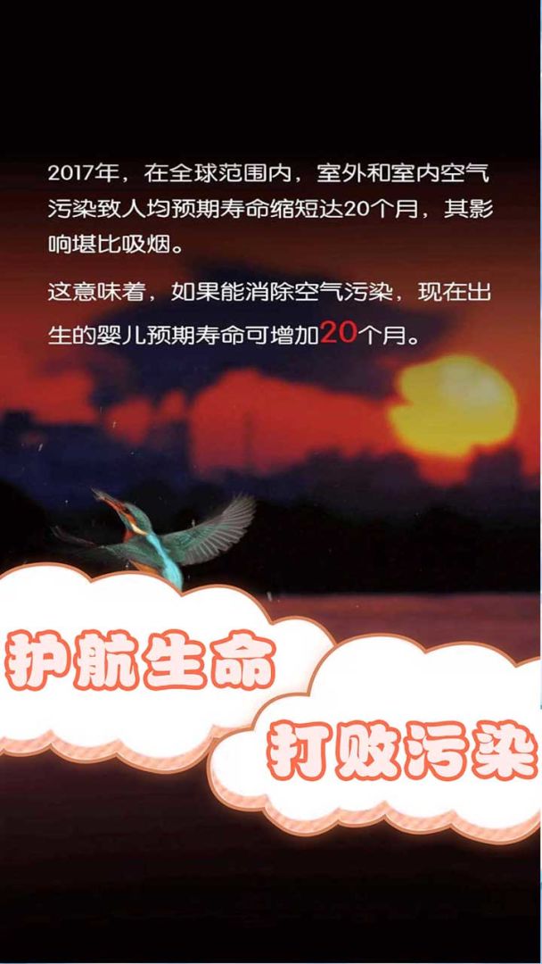 1、游戏画面:游戏画面简洁,角色清新可爱,还有相应的污染物介绍,警醒人们重视空气污染。