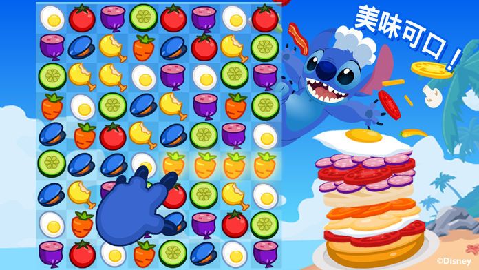 在60秒内滑动连结最多食材以争取最高分数!史迪奇会把你连结的食材叠起