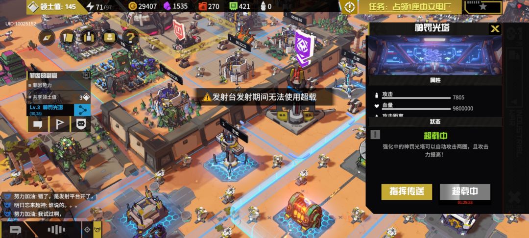 发射塔发射期间是无法手动开启超载的,也就是说,你必须得提前开,那么发射期间扣掉1小时准备时间就能持续1个小时左右的激活状态来帮你打平台。 优点就是不需要担心发射期间推过去上不了建筑了,激活状态尽量平常用,别不舍得。