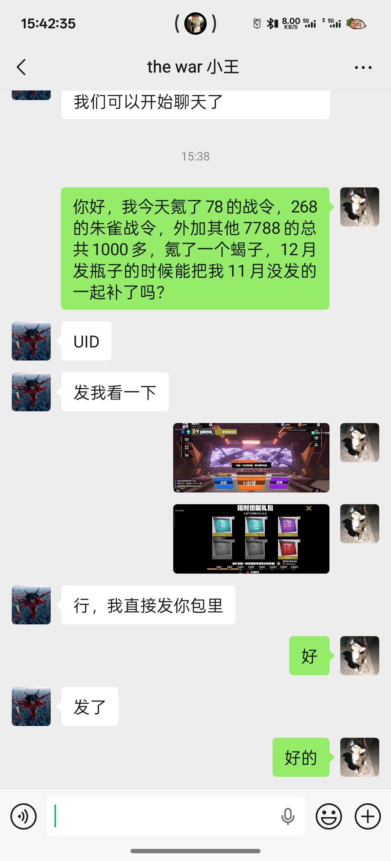 上头了,氪了78的战令,268的朱雀战令,外加其他7788的总共1000多,氪了一个蝎子,在官方评论底下试了一下让补发11月的瓶子,没想到被回复了,意外之喜