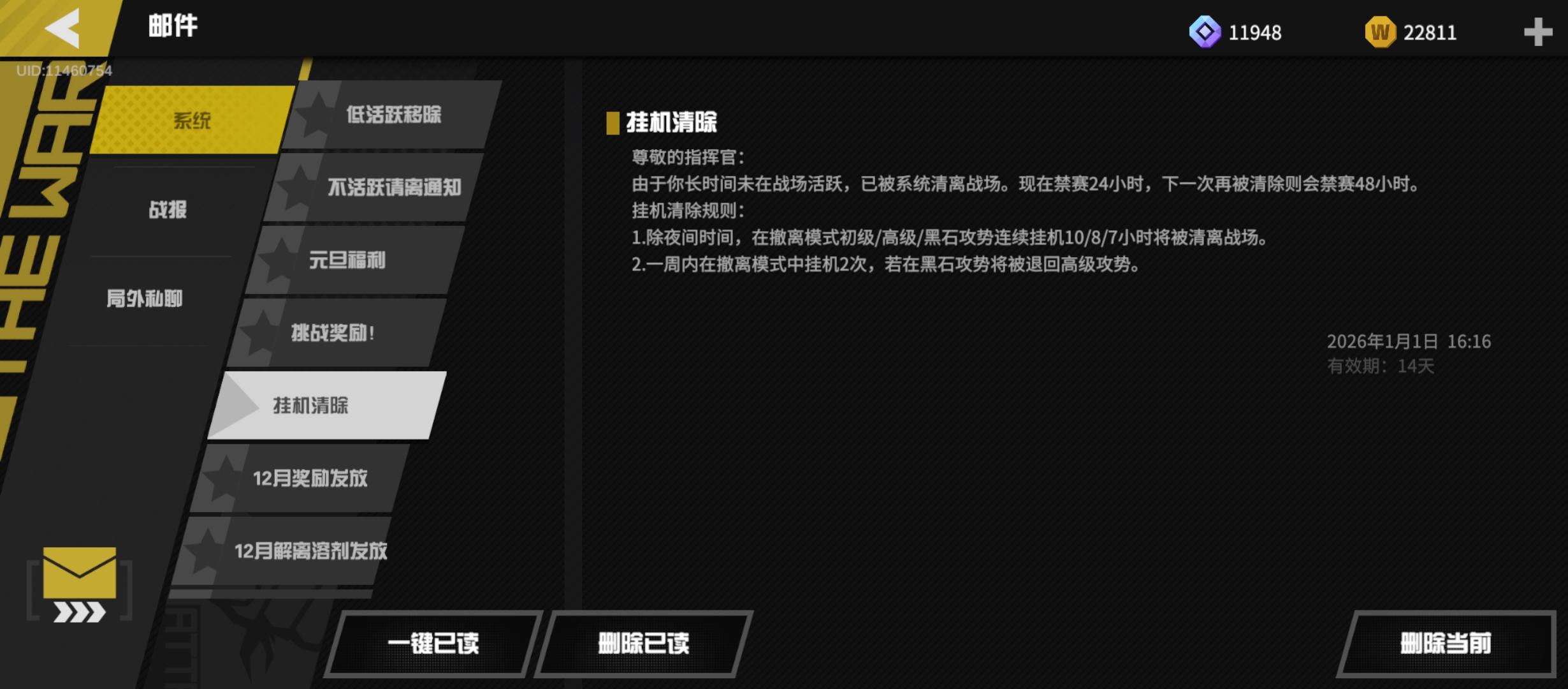 尊敬的指挥官,2025即将结束,过去一年中你是如何度过的呢?生存战争作为时间杀手,相信在你的生活中一定有一定的分量。2026即将到来,我们全体开发组向每一位依然奋战的指挥官们送上祝福,预祝在2026年有一个崭新的开始。元旦三天福利送:1月1日,10逆向解离剂+20冥思结晶1月2日,10逆向解离剂+2逆转录酶1月3日,10逆向解离剂+6黑核额外福利:12月充值玩家的奖励邮件中额外追加6
