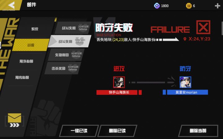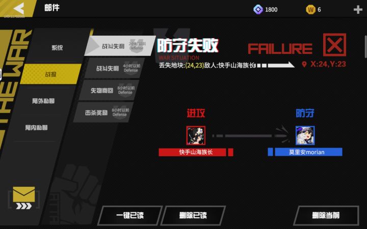 一个挂机接管的家伙,我开荒快一些把四合院门口俩全占到了,然后这个神入一看残局接管啥也拿不到就把我暗钢矿打了,我上线之后看到了很气但是也没招,就花弹头要打回来,他还不想放用了一堆角炮塔拖时间然后拿他3000血的女武神上演了进场被秒的画面。地抢回来了也把他团灭了,我想能杀一杀他不安分的心了,就做做任务下线了。结果刚才一上线,又弹出来一个通知,原来他等我一下线趁我不在马上又抢回来了。。。要