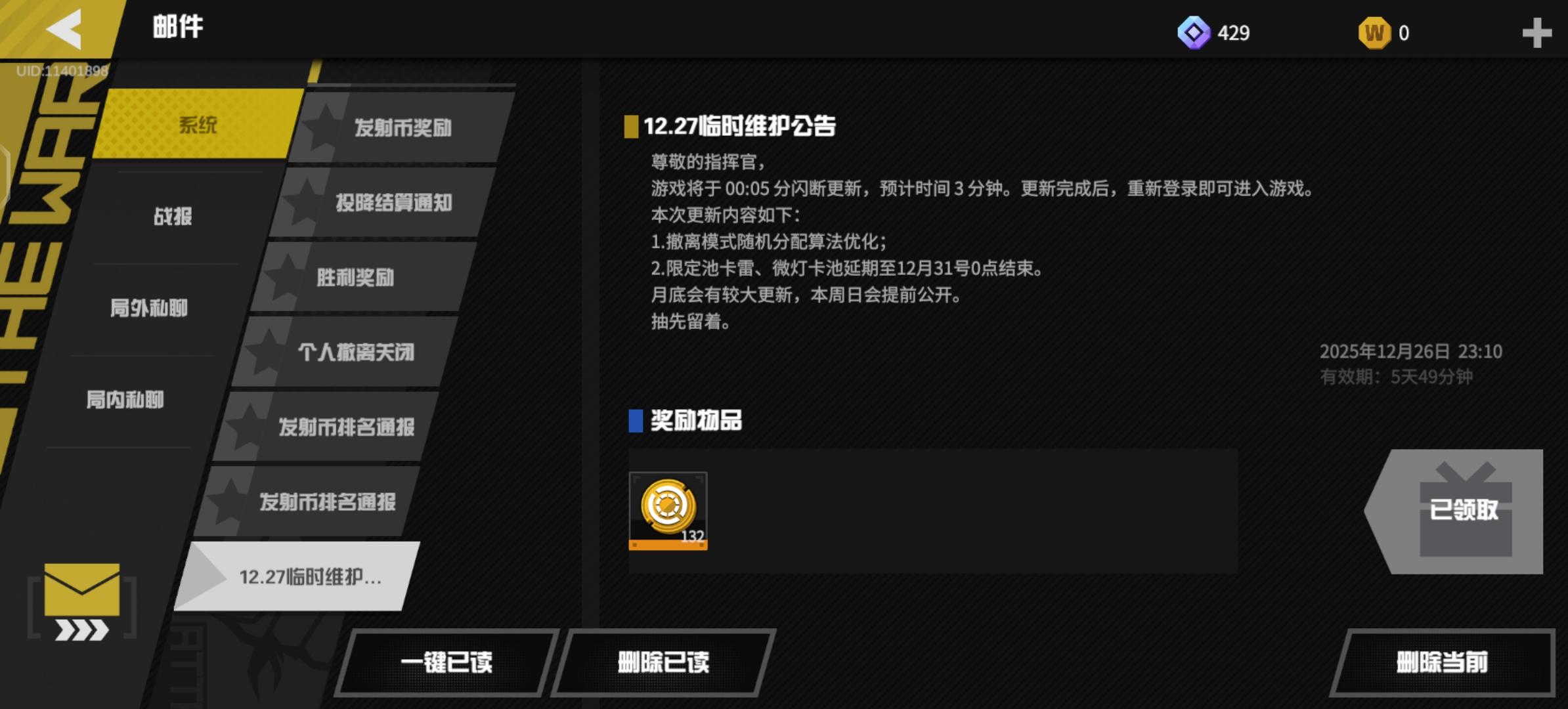 尊敬的指挥官,游戏将于12.27凌晨 00:05 分闪断更新,预计时间 3 分钟。更新完成后,重新登录即可进入游戏。本次更新内容如下:1.撤离模式随机分配算法优化;2.限定池卡雷、微灯卡池延期至12月31号0点结束。月底会有较大更新,本周日会提前公开。132抽,先留着。