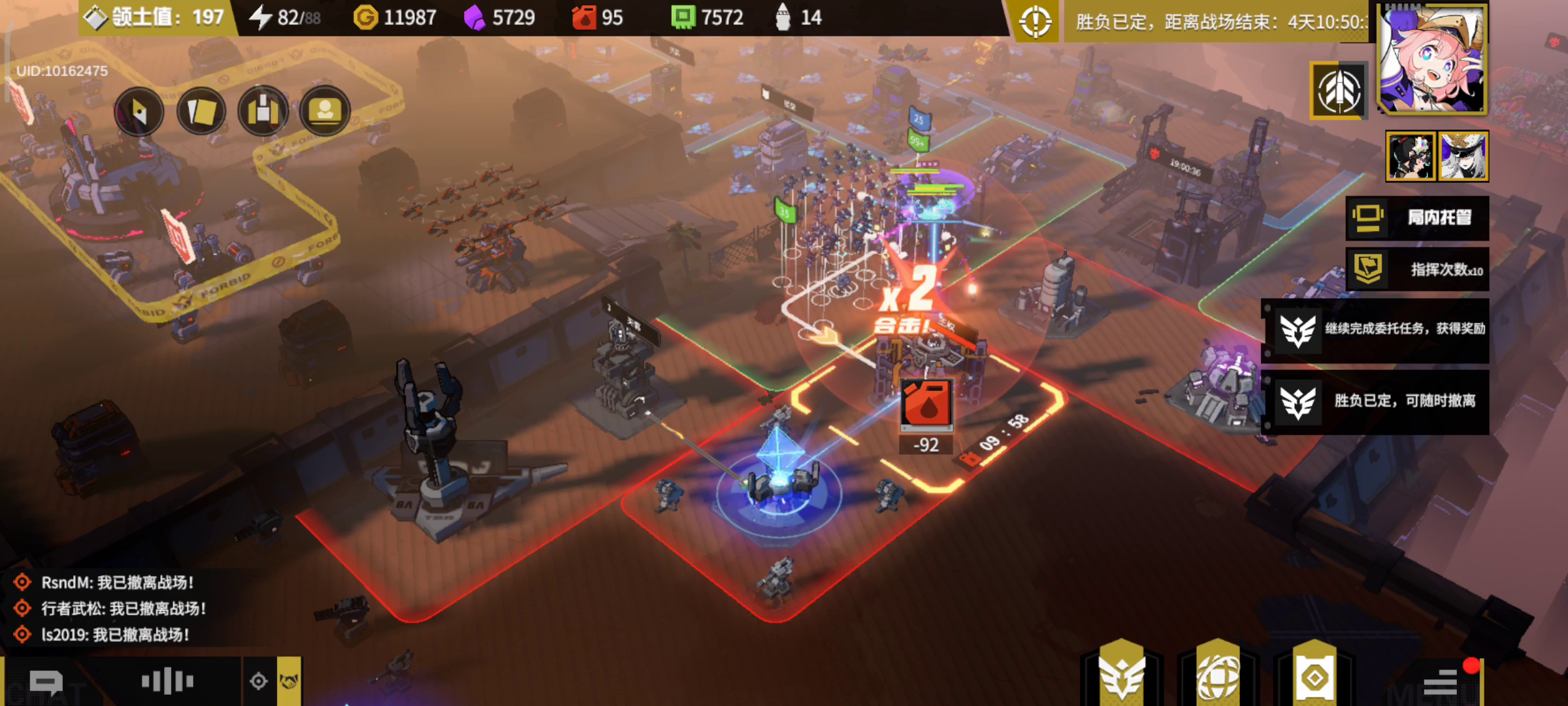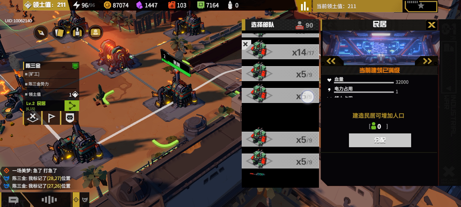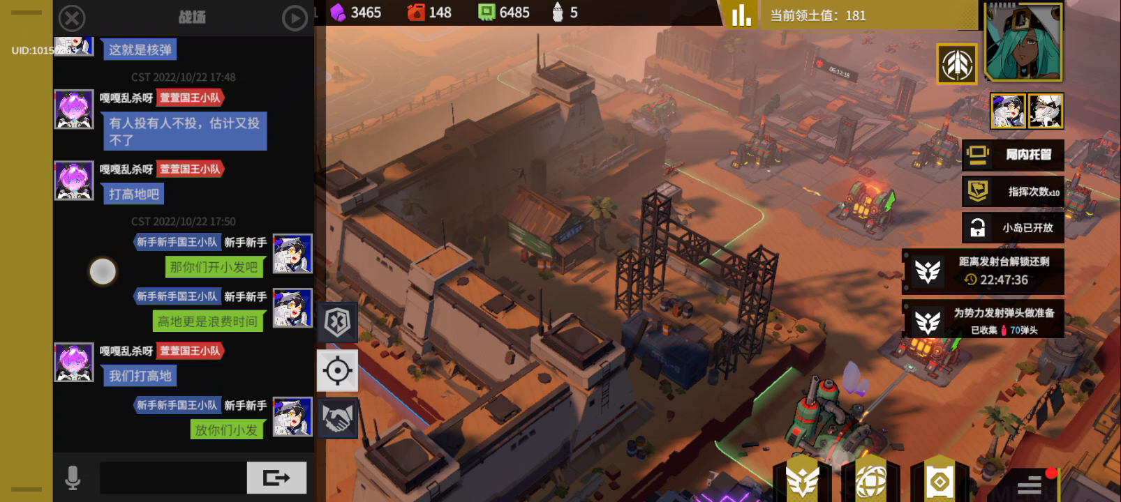 聊天记录摆在这里了,大家可以自己看。😂 简单概括一下自国王塔分配之后的局面吧,就是碾压,无论从盟友活跃度来说(怎么说吧,凌晨两点我上线看到还有人在线),还是部队战力来说(我队友二攻势k9战力七千五以上,哇我真不知道他是怎么弄的),又或是资源点数量来说(就是岛的数量,对面的小发也有涉及但不多,这也是我选择可以放他们小发来换取快点结束对局的愿因,但我们这边空军有三个还有阿托品完全可以偷掉他的小发,所以我自认为我算是挺好的了),不过没有把他们塔打下来,因为盟友在线时间不一致统一不到一起,所以就没有过分的去打对面。🌝 但我们有过一次大战,双方技能都开了,结果是我方顶着对面骑士塔(王权都被我们拆掉了)的攻击之下还剩八九个载具,部队一大堆(他们还开过核弹,但被我们走位躲过去了),对方团灭。😳 以上种种都能证明这是一场实力完全不均衡的碾压对局,现在他们开始摆烂了,不打高地但也不开小发,怎么说吧,这种恶心的人都该去die🙃