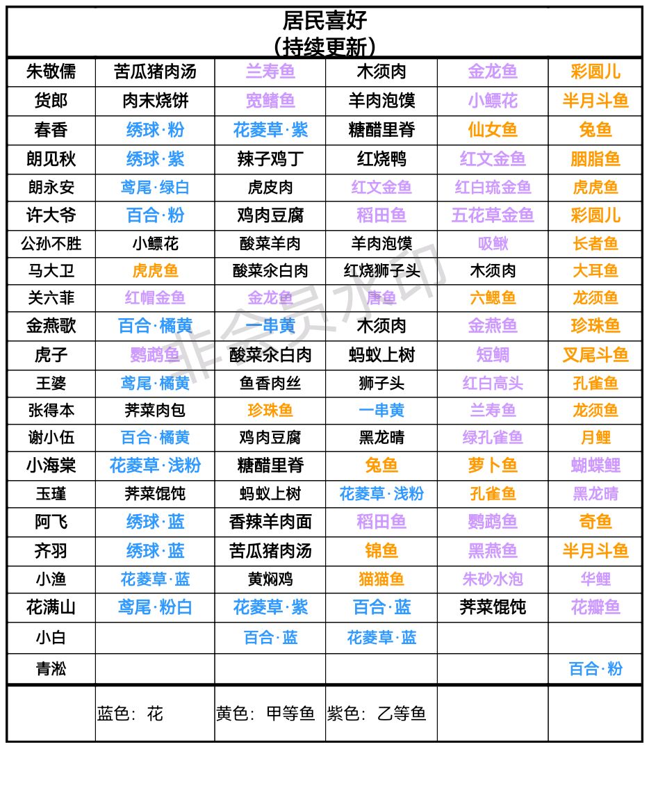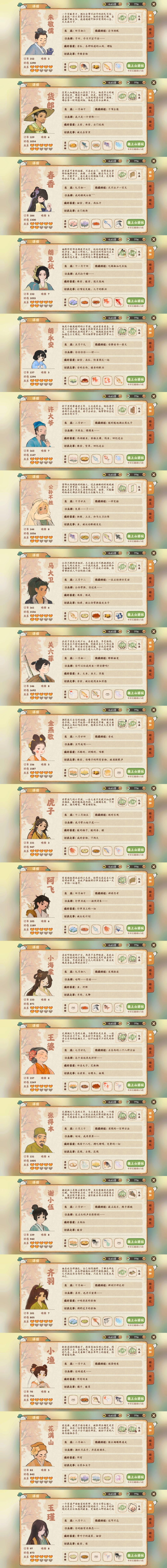 桃源居民喜好一览图 #桃源深处有人家# 🌿图1-合集 🌿图2-壹 🌸朱敬儒、货郎、春香、郎见秋、郎永安 🌿图3-贰 🌸许大爷、公孙不胜、马大卫、关六菲、金燕歌 🌿图4-叁 🌸虎子、阿飞、小海棠、王婆、张得本 🌿图5-肆 🌸谢小伍、齐羽、小渔、花满山