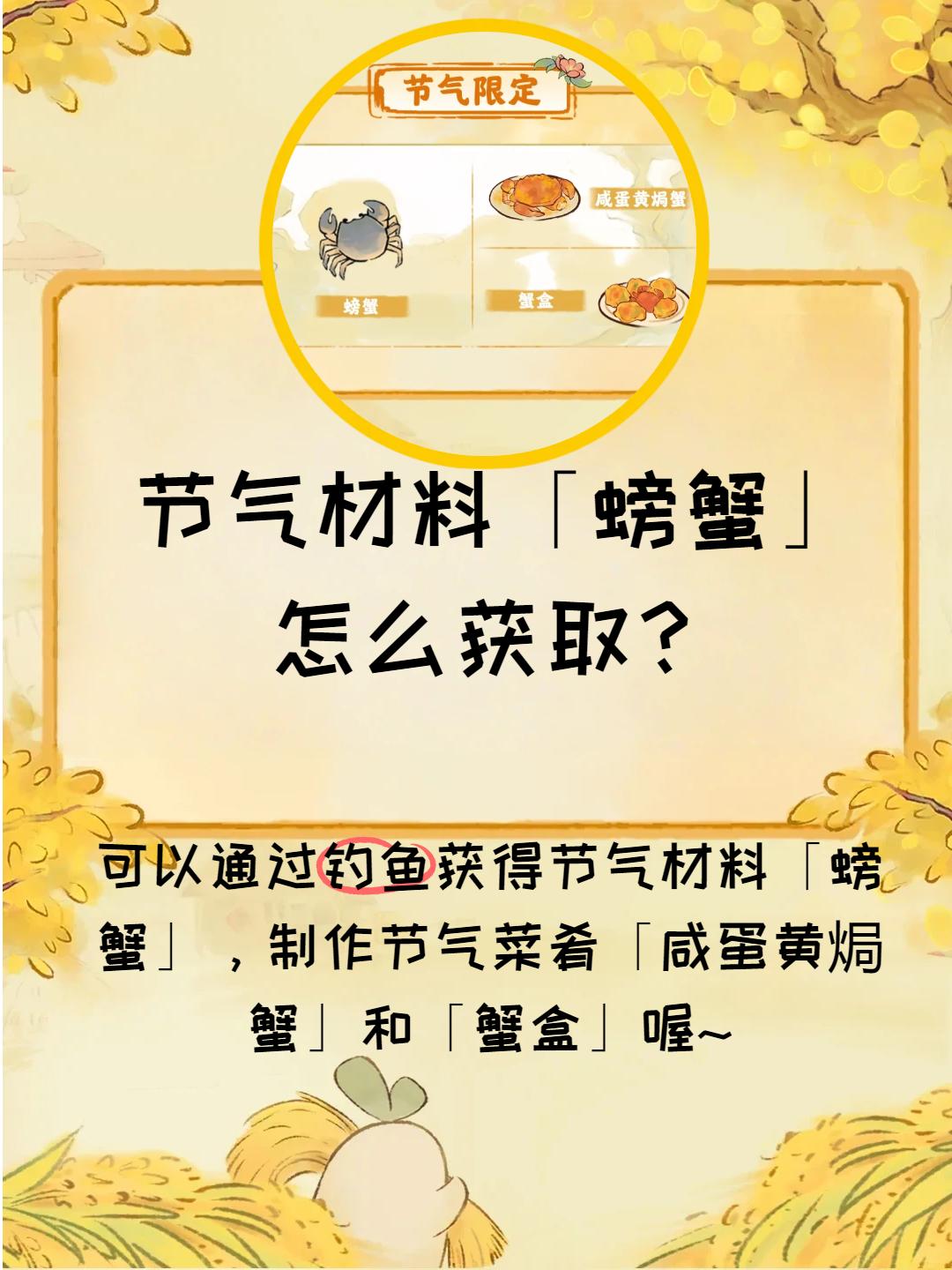 霜降水返壑,风落木归山。 各位萝萝山的山民好呀! 霜降节气即将到来,届时昼夜温差变化大,各位山民要注意防寒保暖萝。萝卜今日带来了霜降节气活动的预告哟! 活动名称:一夜霜寒 活动时间:10月24日10:00-10月26日24:00 山民在活动期间内,钓鱼可获得特殊素材「螃蟹」和制作特殊节气菜肴「咸蛋黄焗蟹」「蟹盒」,提交节气订单可以额外获得玥琅。萝萝山已准备好了本期的节气限定建筑,山民记得参与活动获