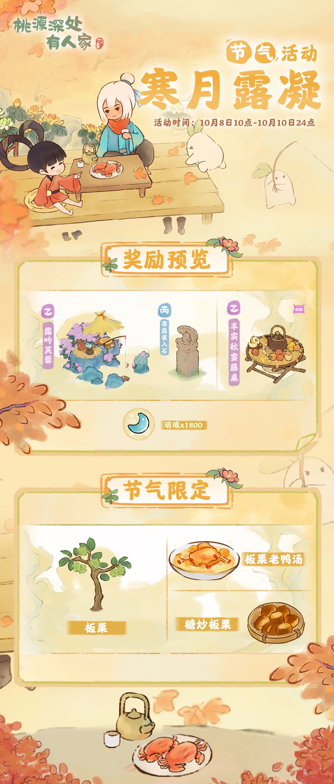 紫葛蔓黄花,娟娟寒露中。 各位萝萝山山民好呀!十月长假里,我们即将迎来寒露节气萝,今日小花整理了一份寒露节气活动的预告,感兴趣的山民不要错过啦! 活动名称:寒月露凝 活动时间:2025年10月8日10:00 - 2025年10月10日24:00 山民们在活动期间可以种植节气农作物「板栗」,用来制作美味的节气菜品「板栗老鸭汤」和「糖炒板栗」。 同时装饰商店将上线秋季家居套装「千粟秋厢」中