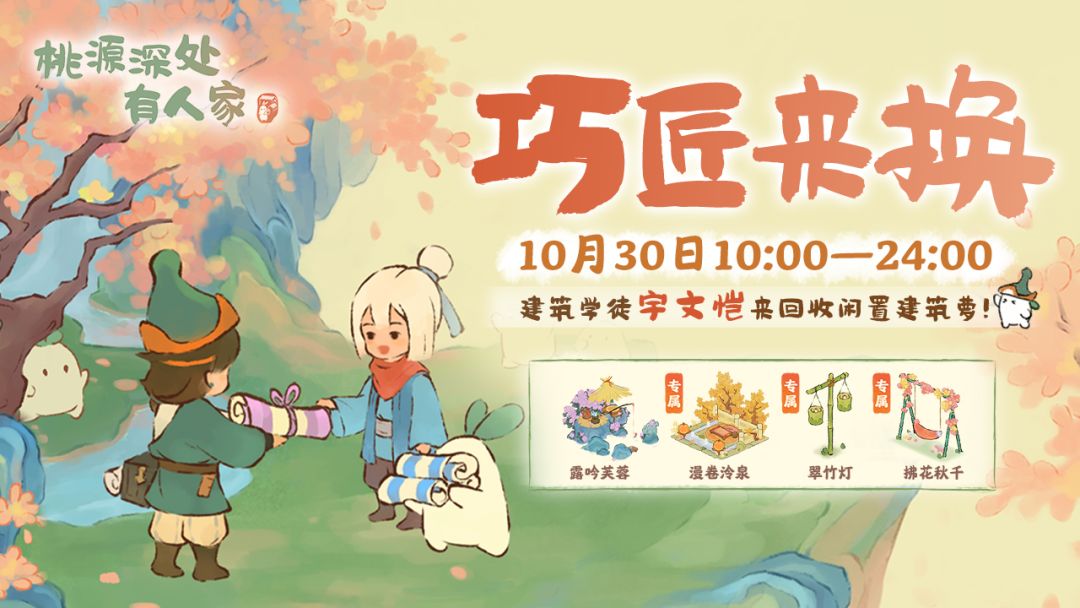 [表情_开心]各位萝萝山山民好呀,新一期「巧匠来换」活动来啦! [表情_期待]在10月30日10:00-24:00期间,山民可找寻宇文恺消耗已拥有的丙等建筑来兑换活动建筑哦。山民可前往兑换乙等建筑「露吟芙蓉」以及活动专属乙等建筑「漫卷泠泉」、丙等建筑「翠竹灯」、「拂花秋千」。 [表情_酷]感兴趣的山民可不要错过萝! #桃源深处有人家 #桃源玉成山河