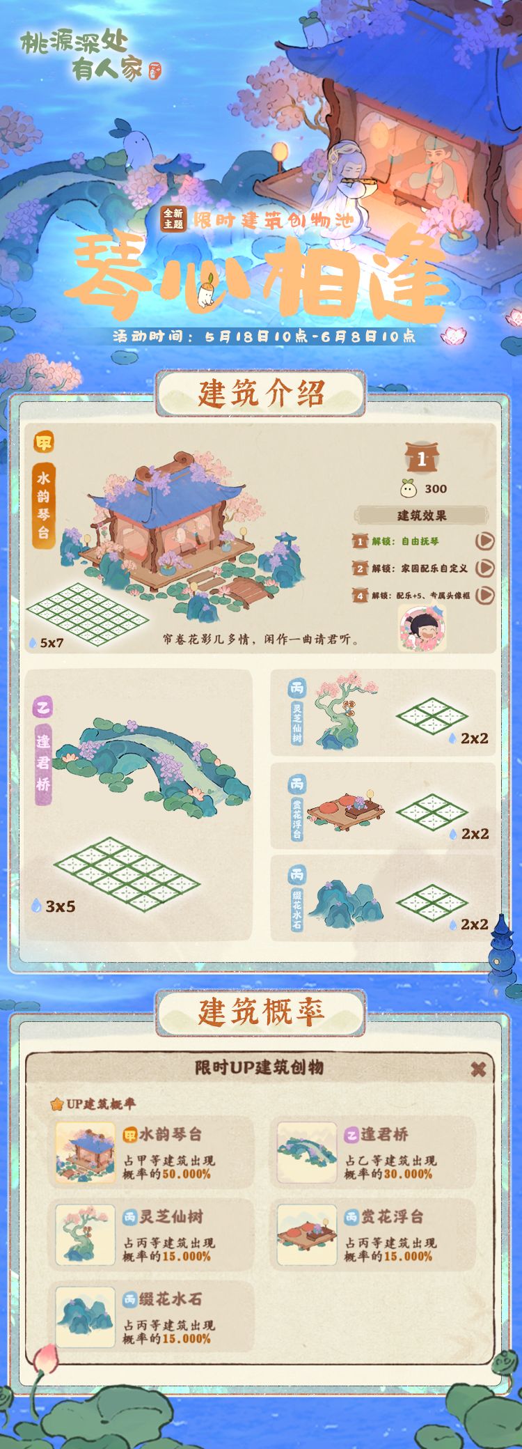 各位萝萝山的山民,大家好呀~ 闲坐浮台缀花音,琴心相逢奏柔情。 2023年5月18日萝萝山将会进行一次更新。 接下来请跟随我的视角,一起看看本次更新的全部内容吧! ▶「琴心相逢」限时UP建筑创物池开启 帘卷花影几多情,闲作一曲请君听。 本次限时UP建筑创物池「琴心相逢」将会上架甲等建筑「水韵琴台」 不仅可以改变家园配乐,还能随心抚琴,弹奏只属于你的天籁乐曲。 此外还有乙等建筑「逢君桥」、丙等建筑