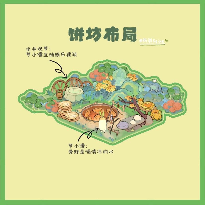🍃桃源深处有人家|饼坊布局(有地基) 🍃主要建筑:饼坊、坐井观萝、芳菊林耀 🥕布局思路:萝小馕戴了一个萝卜叶子的帽子,但实际上由于每天工作烤饼导致萝小馕的叶子已经被烤干很久了(秃头萝卜石锤)。 萝小馕的爱好是:喝上一口清凉的井水 而恰好坐井观萝的互动就是萝小馕喝井水~所以把这两个建筑放在了一起布局。#桃源深处有人家#桃源深处有人家布局展示#桃源深处有人家装修