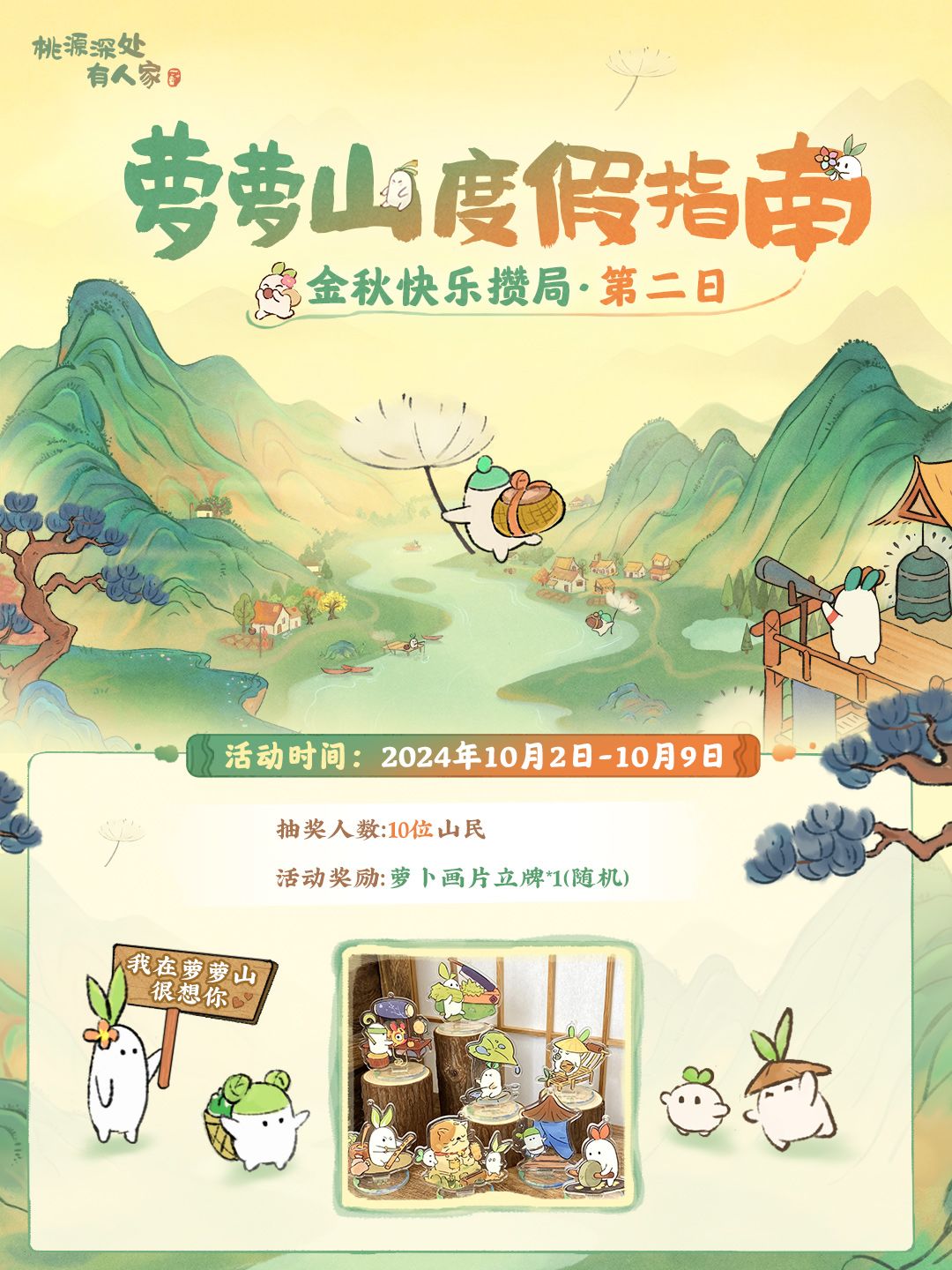 🍁秋风吹叶落,山山舞金黄 [表情_期待]长假期间,各位山民除了在各种景点打卡,也别忘回我们热闹的萝萝山看看哦,小花可是在萝萝山很想你! [表情_酷]金秋赠礼:萝卜画片立牌*1(随机) 活动时间:10月2日-10月9日 参与方式:点赞及评论本帖 开奖时间:10月15日 抽奖人数:10人 #桃源深处有人家