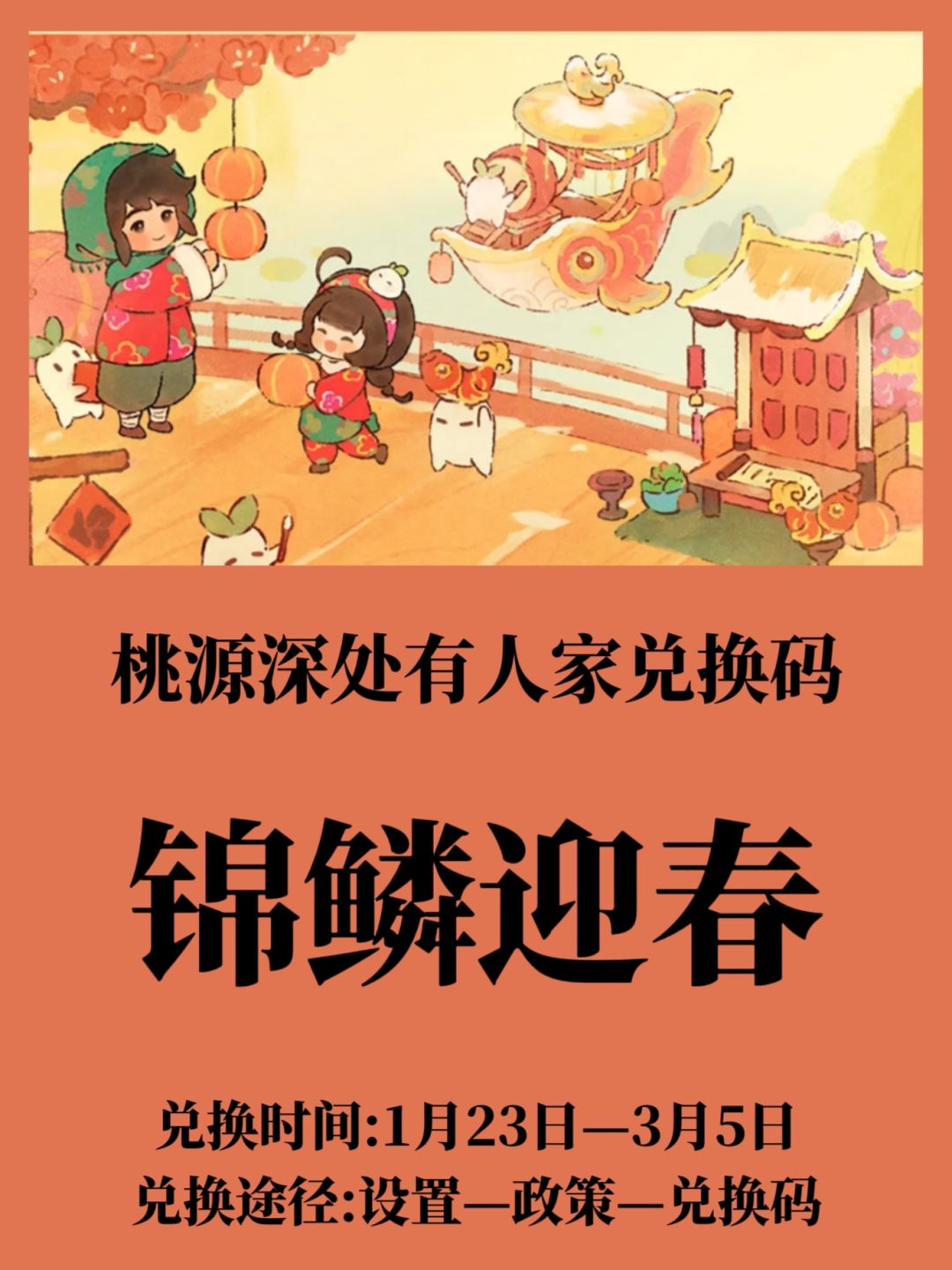 桃源最新兑换码:锦鳞迎春 兑换时间:1月23日—3月5日 兑换途径:设置—政策—兑换码 #桃源深处有人家