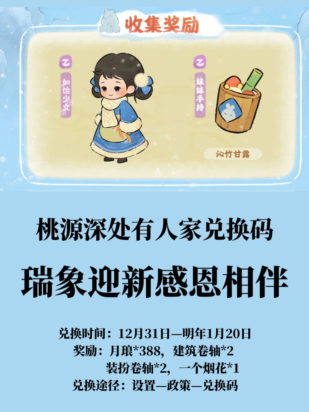 有效期:12月31日-次年1月20日 奖励内容:玥琅*388+建筑卷轴*2+装扮卷轴*2+烟花*1 兑换方式:设置-政策-兑换码 #桃源深处有人家 #桃源颐养四时