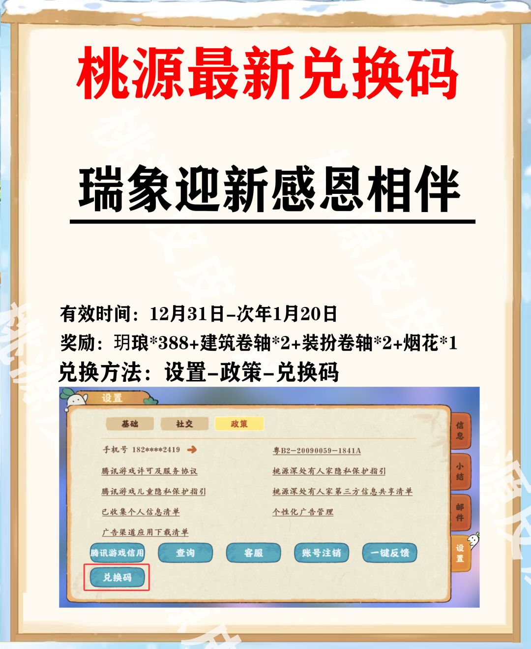 桃源深处有人家兑换码:瑞象迎新感恩相伴 兑换时间:12月31日—明年1月20日 奖励:月琅*388,建筑卷轴*2 ,装扮卷轴*2,一个烟花*1 兑换途径:设置—政策—兑换码 #桃源深处有人家