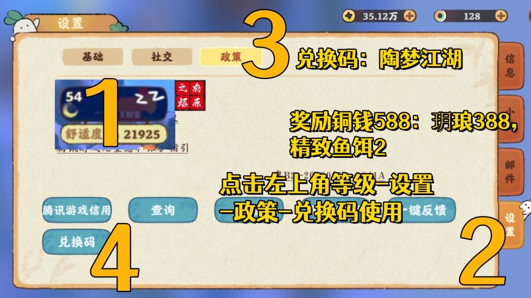 1:兑换时间: 11月21号00: 00-12月25号: 23: 59 2:兑换码: 宫烟故梦 3:预测兑换物品: 铜钱*588 +玥琅*388 +精致鱼饵*2 4:领取方式:在游戏内点击[ 头像] - [设置] - [政策] - [兑换码]输入口令码兑换礼包。 #桃源深处有人家 #游戏安利 #游戏推荐 #游戏种草计划