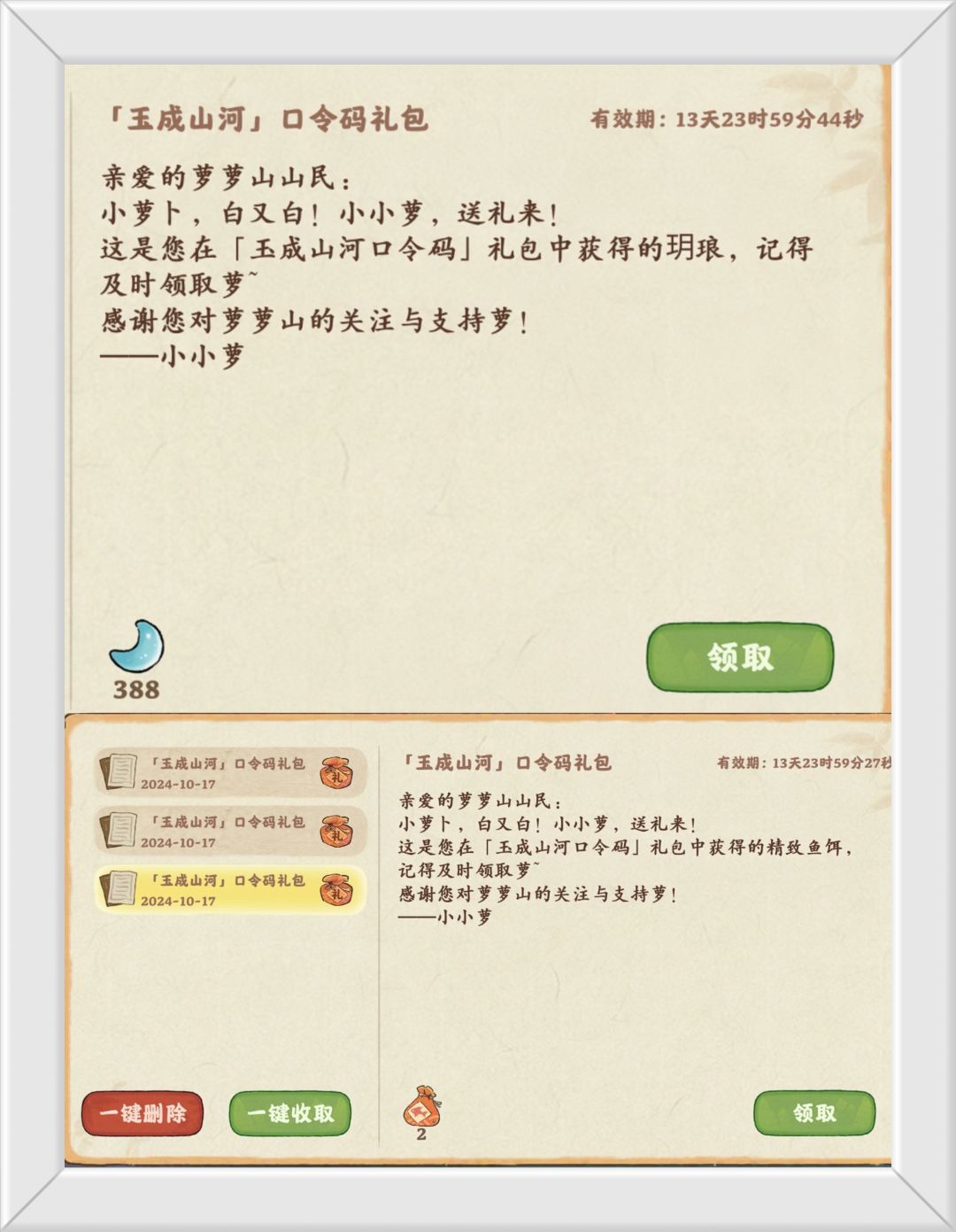1:兑换时间:10月17日-11月20日 2:兑换码:玉成山河 3:兑换物品:铜钱*588 +玥琅*388 +精致鱼饵*2 4:领取方式:在游戏内点击[ 头像]- [设置]- [政策]-[兑换码]输入口令码兑换礼包。 #桃源深处有人家 #今天游戏圈发生了啥