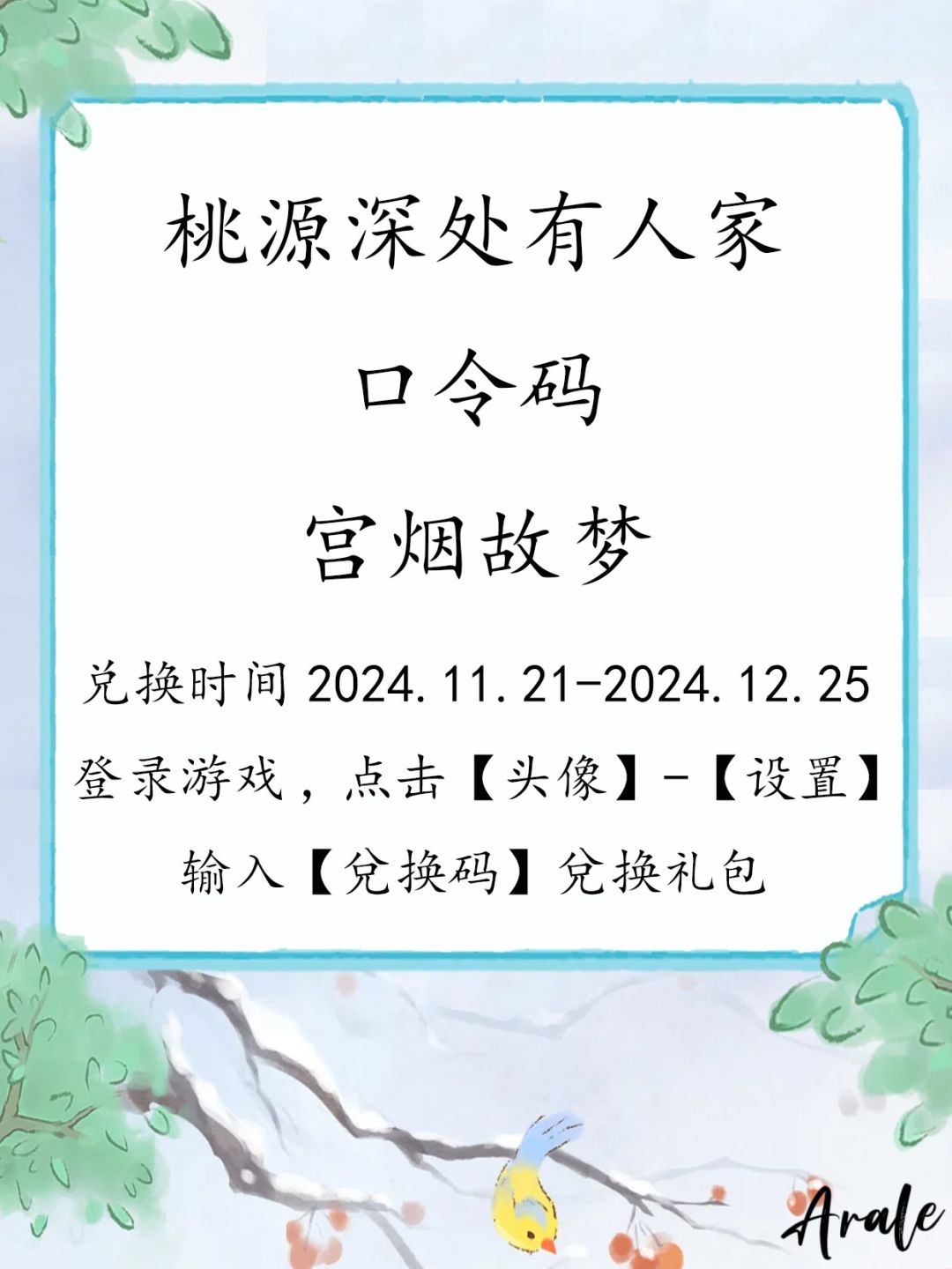 桃源深处有人家口令码:宫烟故梦,兑换时间2024.11.21-2024.12.25,登录游戏,点击【头像】-【设置】输入【兌换码】兌换礼包。#桃源深处有人家