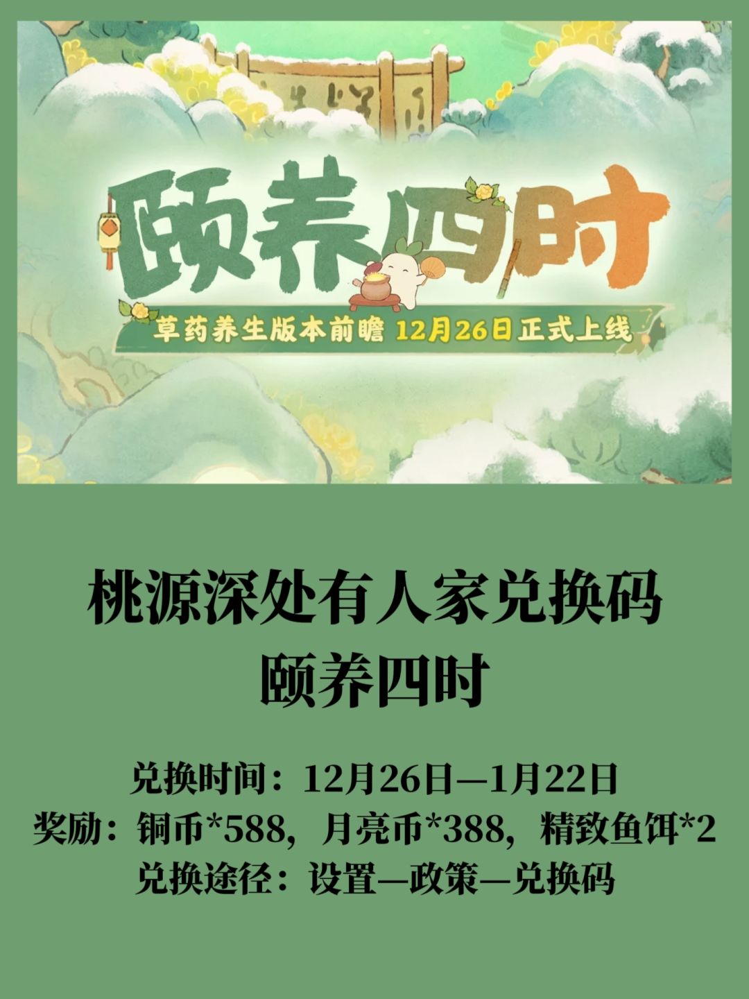 兑换码名称: 颐养四时 兑换方法: 设置-政策-兑换码 兑换内内容: 月亮币388 + 铜币588 + 精致鱼饵*2 兑换有效期: 12月26日-1月22日 #桃源深处有人家 #今天游戏圈发生了啥