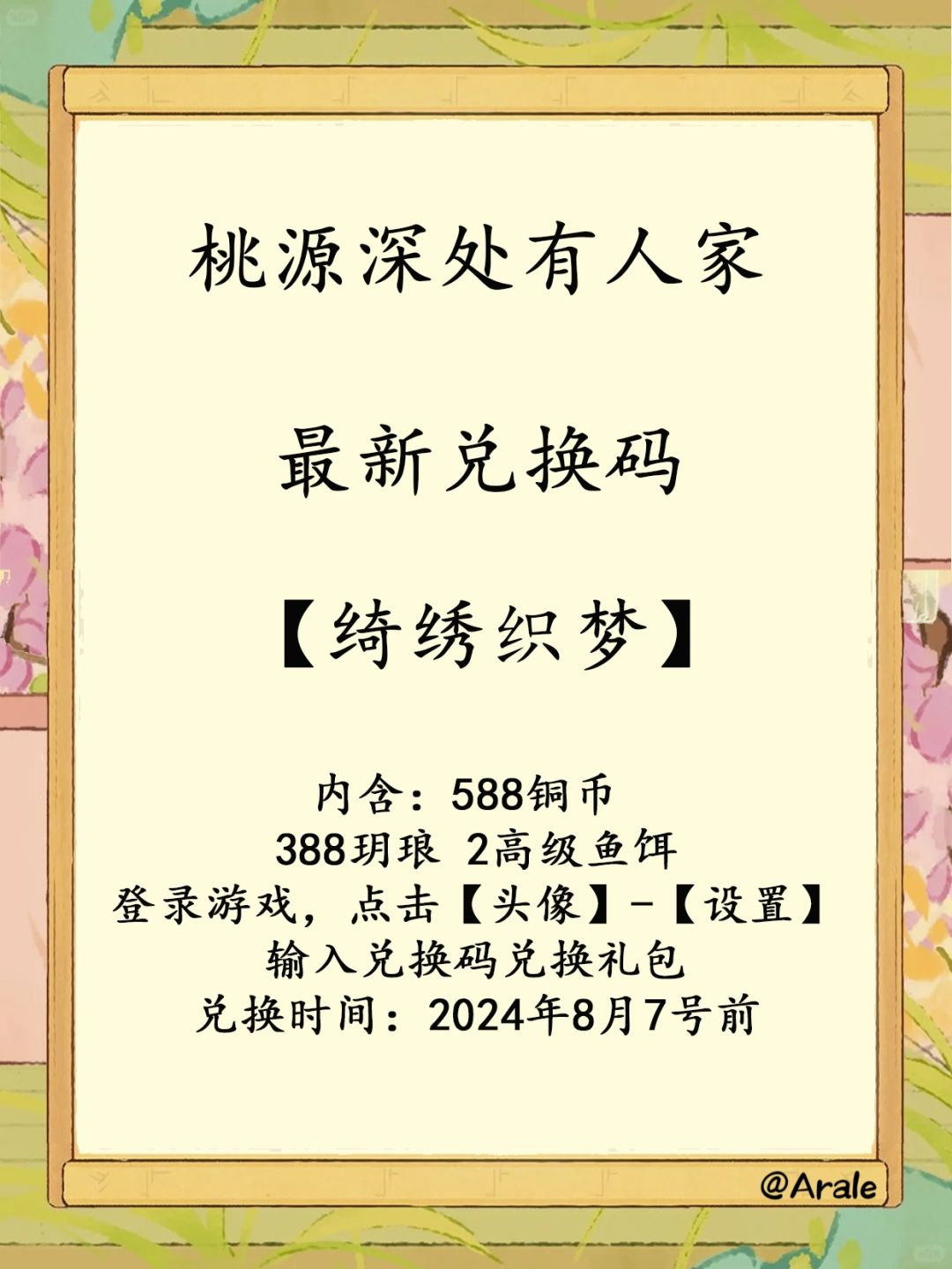 桃源深处有人家最新兑换码【绮绣织梦】 内含:588铜币 388玥琅 2高级鱼饵 登录游戏,点击【头像】-【设置】 输入兑换码兑换礼包 兑换时间:2024年8月7号前#游戏安利#游戏推荐#桃源深处有人家#桃源刺绣攻略#游戏讨论